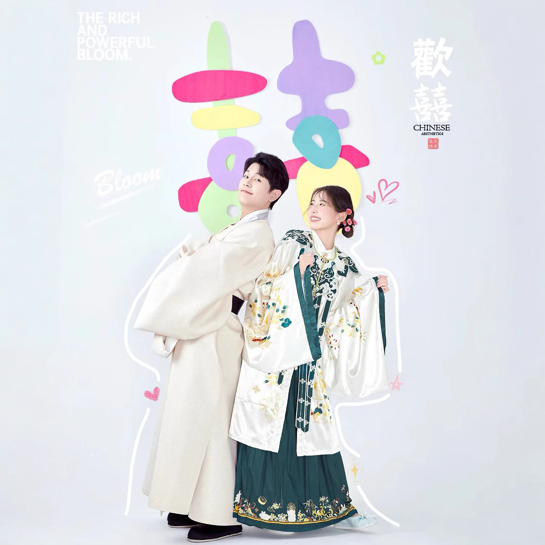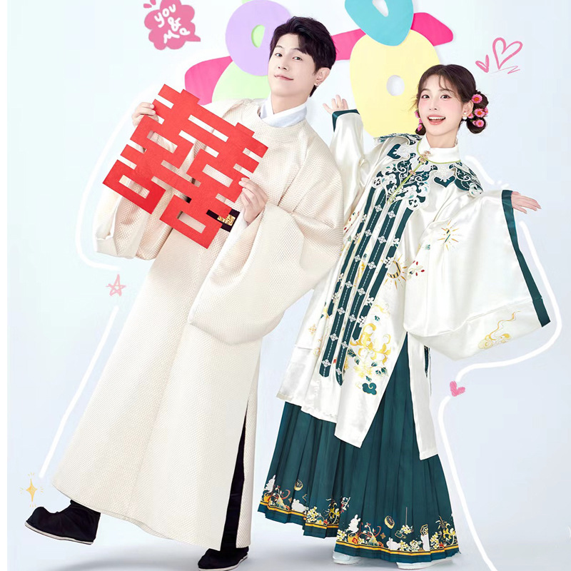 男款包含:连体长袍 交领小衫 腰带 女装包含: 重工云肩 立领大袖衫 百褶裙