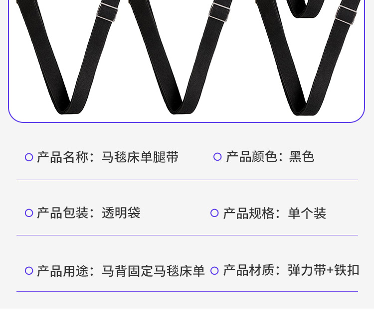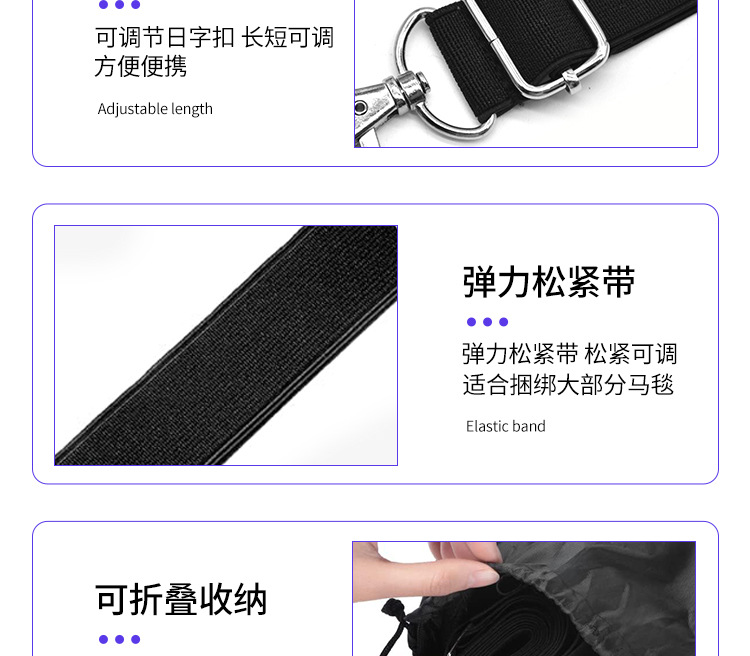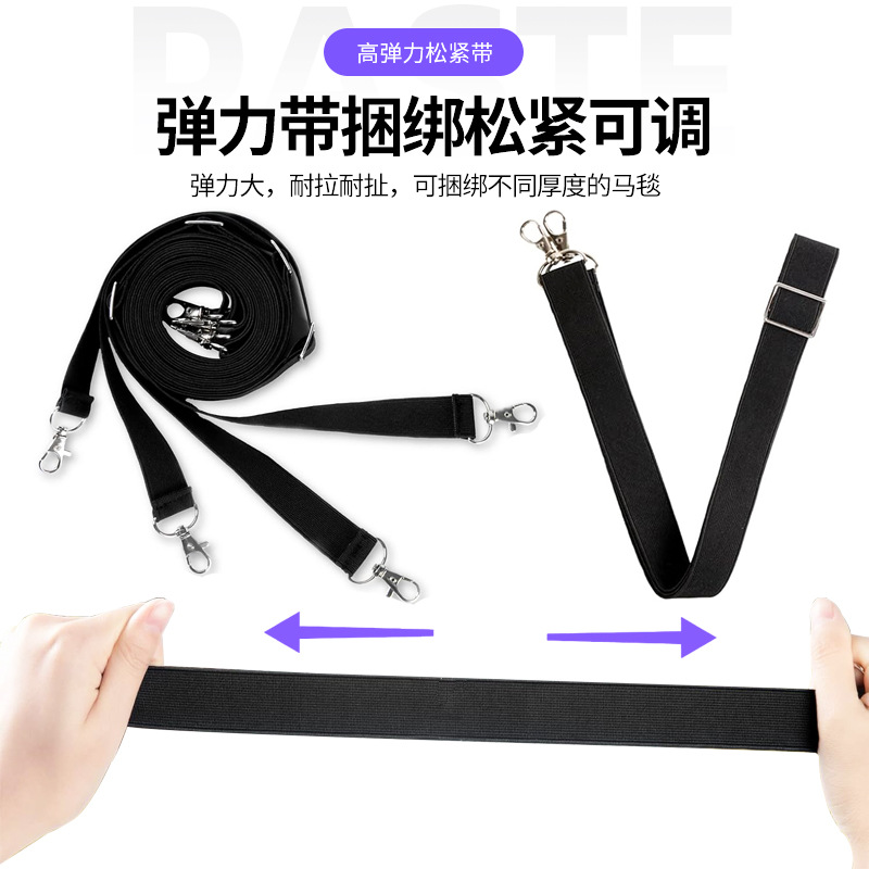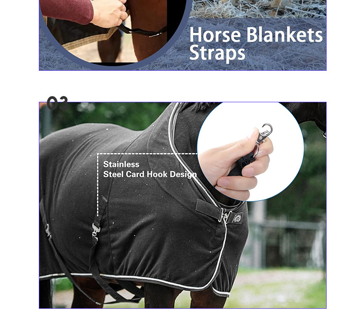 功能:弹性腿带用于固定您的马毯,使您不会担心尴尬的打结。不再手痛,也节省你的时间。我们的腿带兼容几乎任何马毯,并可以调整长度,以适应腿带。