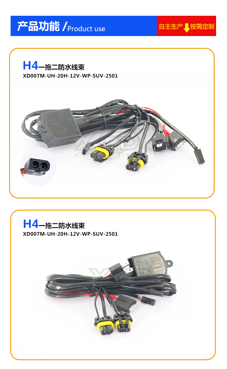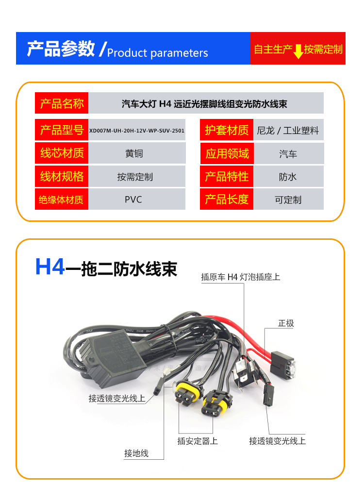 产品参数:H4一拖二防水线束