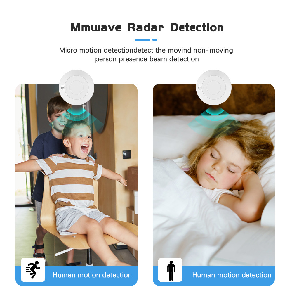 具有人体存在、人体静态、人体微动和人体移动运动检测功能,可检测区域内是否有人,甚至可以通过毫米波雷达检测功能准确检测人员睡眠等静态状态。
