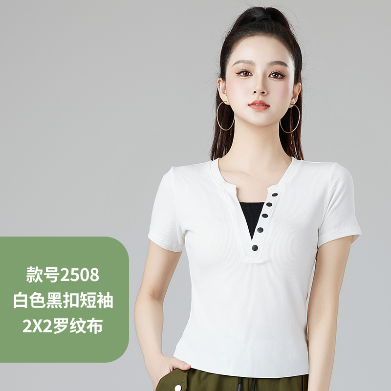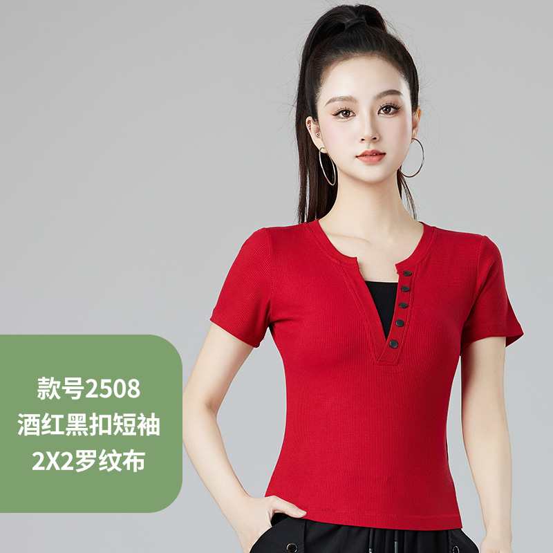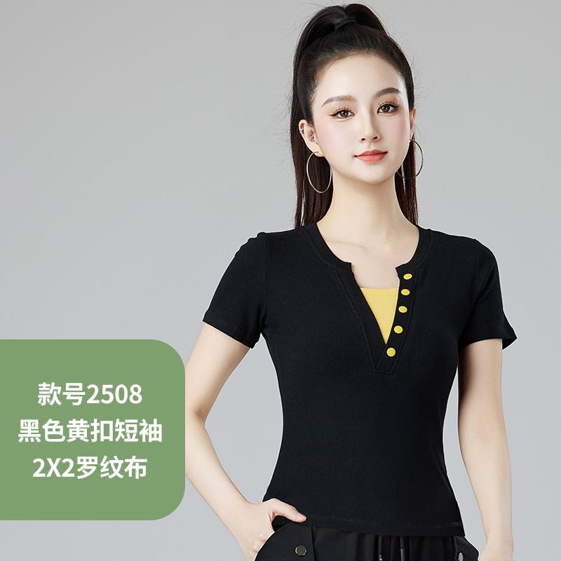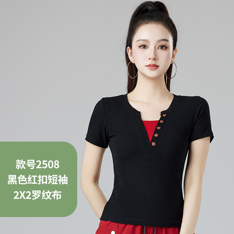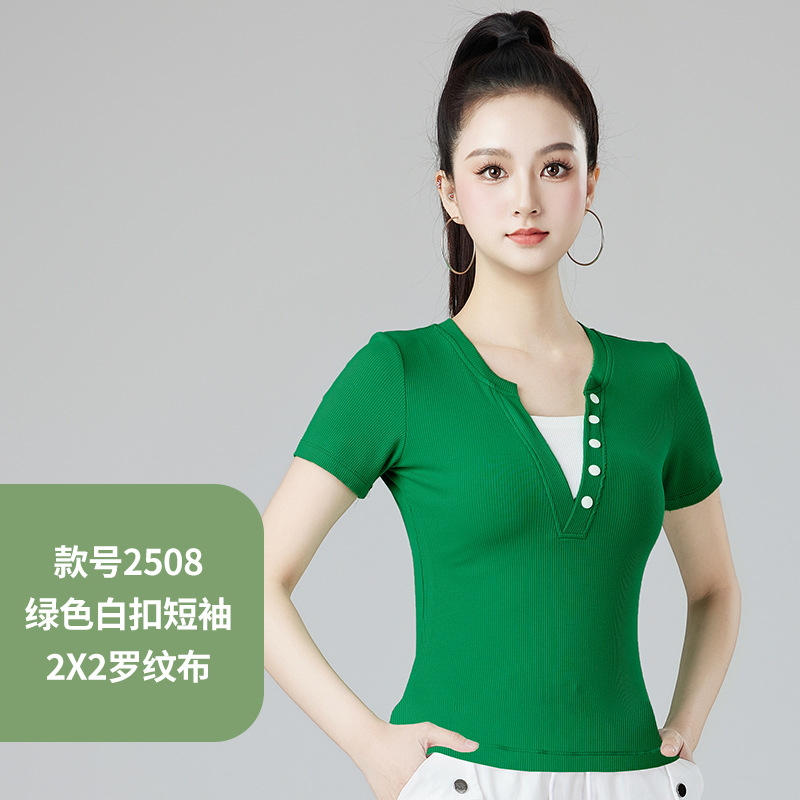 Черный топ с короткими рукавами и красными пуговицами.; Черный топ с короткими рукавами и желтыми пуговицами.; Красный топ с короткими рукавами; Зеленый топ с короткими рукавами; Белый топ с короткими рукавами