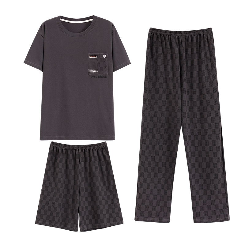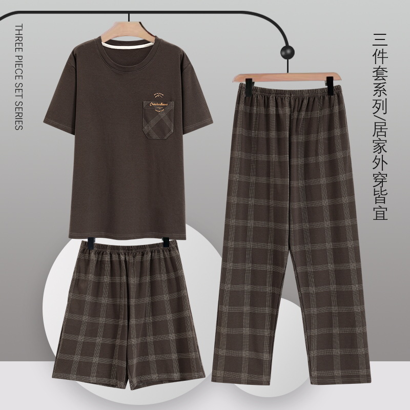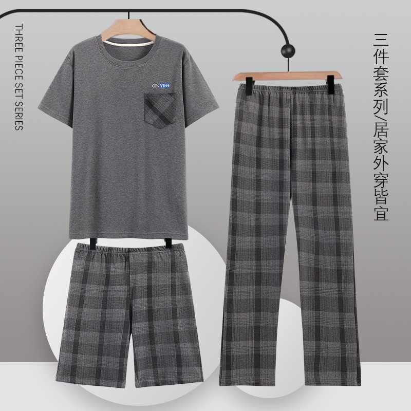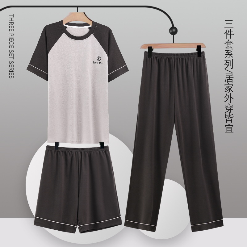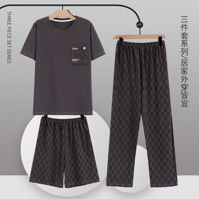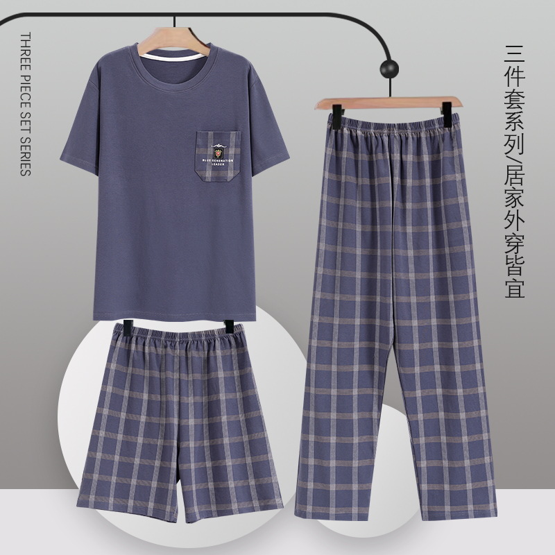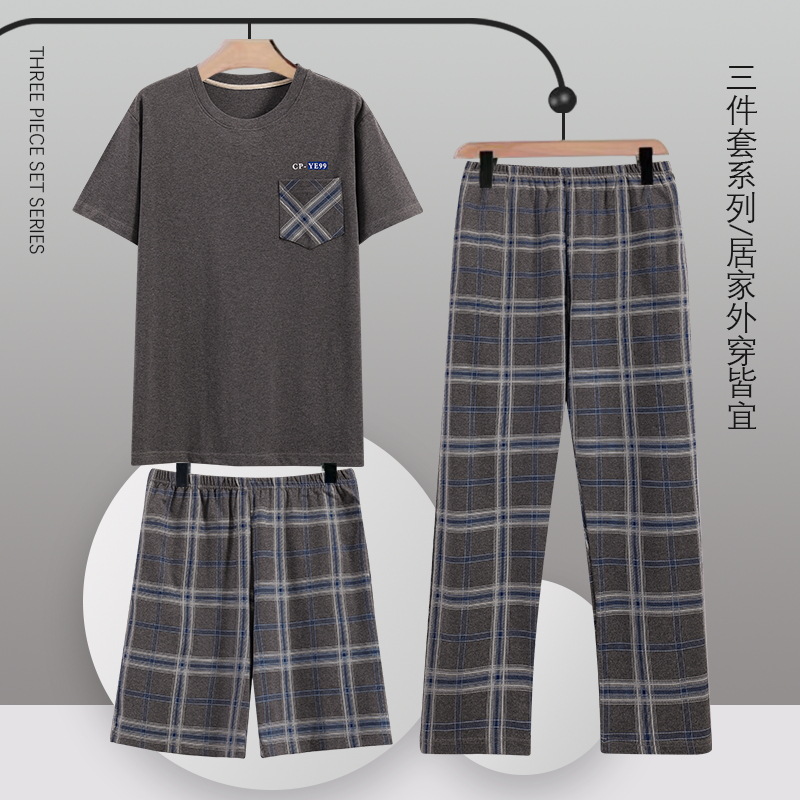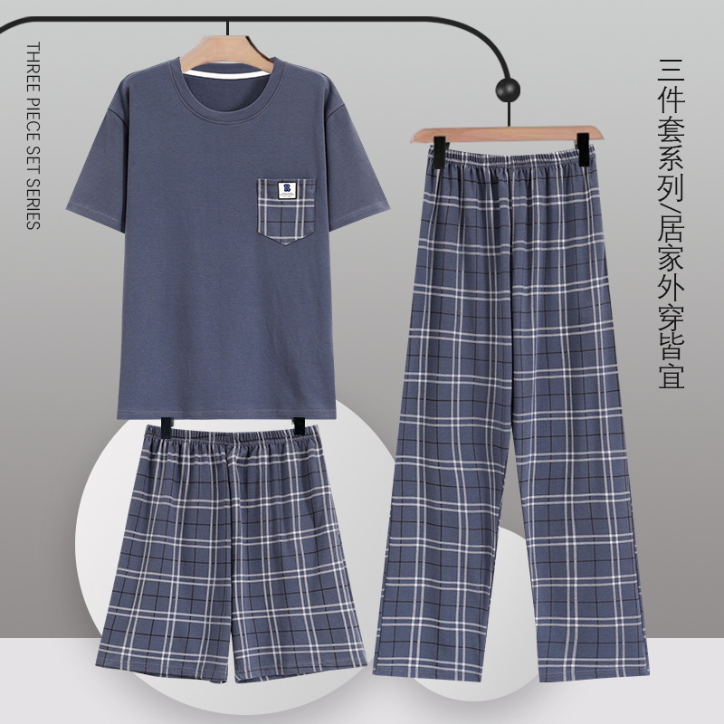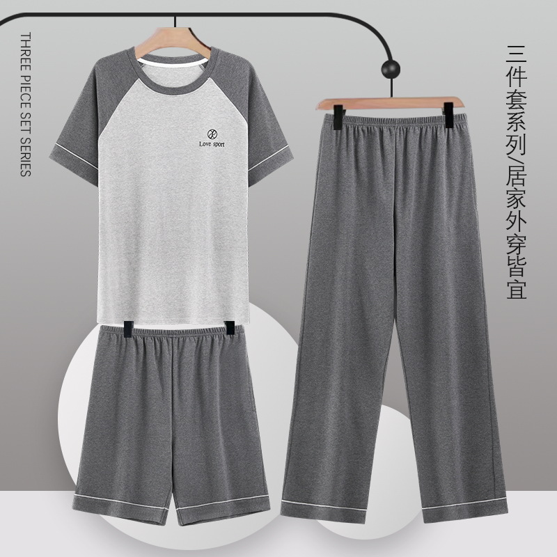 Мужской пижамный комплект из трех предметов, весенне-осенние шорты и брюки из чистого хлопка с короткими рукавами, весенне-летняя домашняя одежда, тонкие костюмы, которые можно носить на улице.