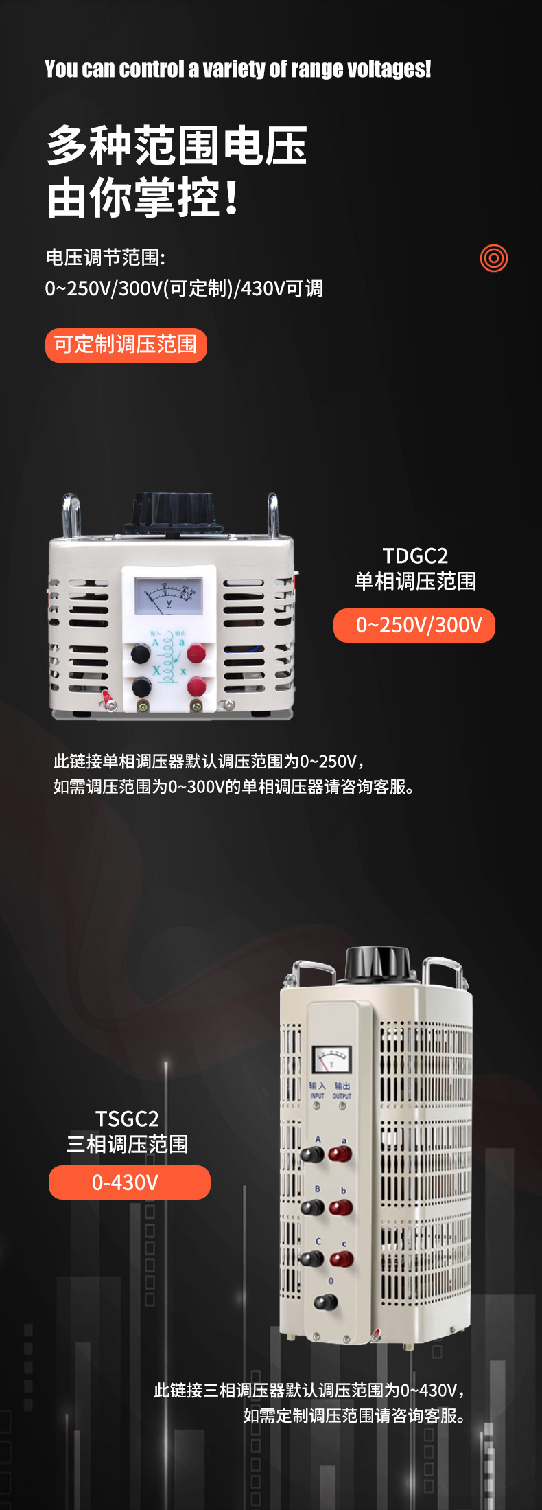 Однофазный TDGC2-500VA (диапазон: 0–250 В); Однофазный TDGC2-1000VA (диапазон: 0–250 В); Однофазный TDGC2-2000VA (диапазон: 0–250 В); Однофазный TDGC2-3000VA (диапазон: 0–250 В); Однофазный TDGC2-5000VA (диапазон: 0–250 В); Однофазный TDGC2-7000VA (диапазон: 0–250 В); Однофазный TDGC2-10КВА (диапазон: 0-250В); Однофазный TDGC2-15КВА (диапазон: 0-250В); Однофазный TDGC2-20KVA (диапазон: 0–250 В); Однофазный TDGC2-30KVA (диапазон: 0–250 В); Однофазный TDGC2-40KVA (диапазон: 0–250 В); Трехфазный TSGC2-1,5КВА (диапазон: 0-430В); Трехфазный TSGC2-3KVA (диапазон: 0–430 В); Трехфазный TSGC2-6KVA (диапазон: 0-430В); Трехфазный TSGC2-9KVA (диапазон: 0-430В); Трехфазный TSGC2-15КВА (диапазон: 0-430В); Трехфазный TSGC2-20KVA (диапазон: 0-430В); Трехфазный TSGC2-30KVA (диапазон: 0-430 В); Трехфазный TSGC2-40KVA (диапазон: 0–430 В)