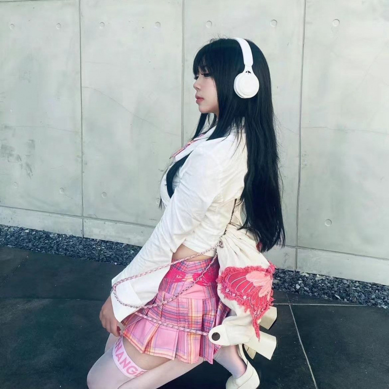 Костюм-рубашка на молнии + американская розовая клетчатая юбка + галстук-бабочка; Американская розовая клетчатая юбка + галстук-бабочка; Американская розовая клетчатая юбка, цельная вещь; Рубашка с молнией на талии + галстук-бабочка в розовую клетку; Рубашка на молнии на талии, цельная вещь