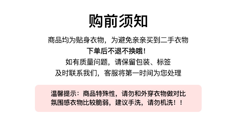 2.非质量问题,请在收货7天内处理,退换货邮费自理(并承担包装费),产品不能拆封使用过,不能影响二次销售。(套、内衣、内裤除外)。(重要:确保包装完好,未使用过,使用过我们概不受理)