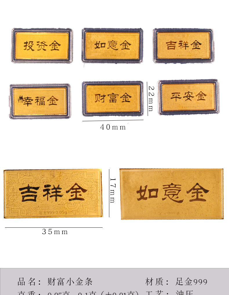 0,05 г версии богатства золота; 0,1 г версии богатства золота; 0,05 г версии золота счастья; 0,1 г версии золота счастья; Версия 0,05 г благоприятного золота; Версия 0,1 г благоприятного золота; Версия Ruyi Gold 0,05 г.; Версия Ruyi Gold 0,1 г; Версия Ping An Gold 0,05 г.; Версия 0,1 г Ping An Gold; 0,05 г версии инвестиционного золота; 0,1 г версии инвестиционного золота