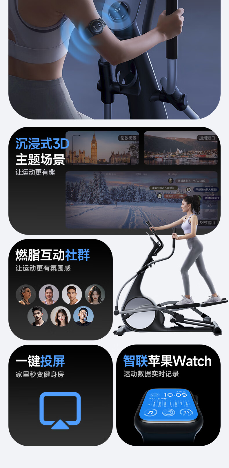 Простой в использовании эллиптический тренажер с регулируемым наклоном для домашнего фитнеса, интеллектуальный, светозвуковой, эффективный и научный, с самогенерирующим передним приводом для сжигания жира в помещении.