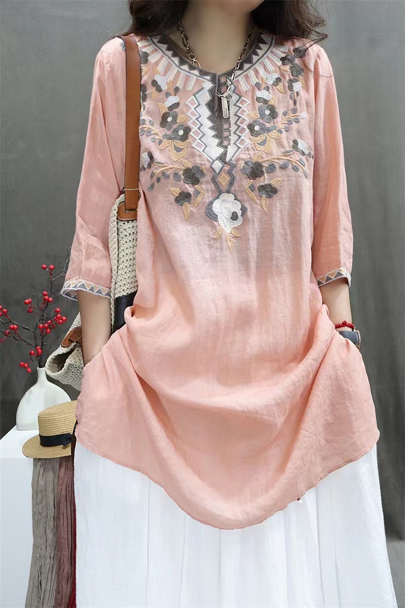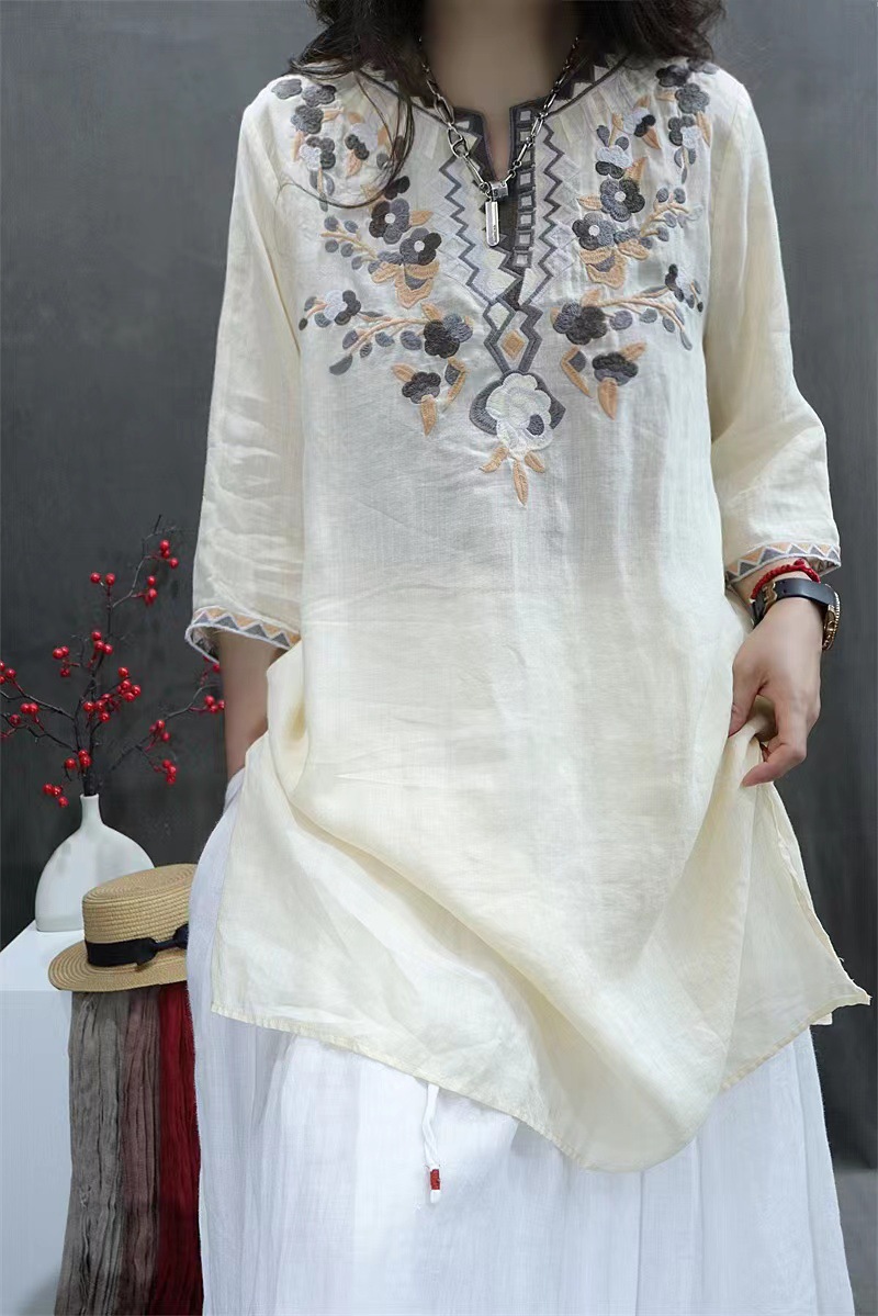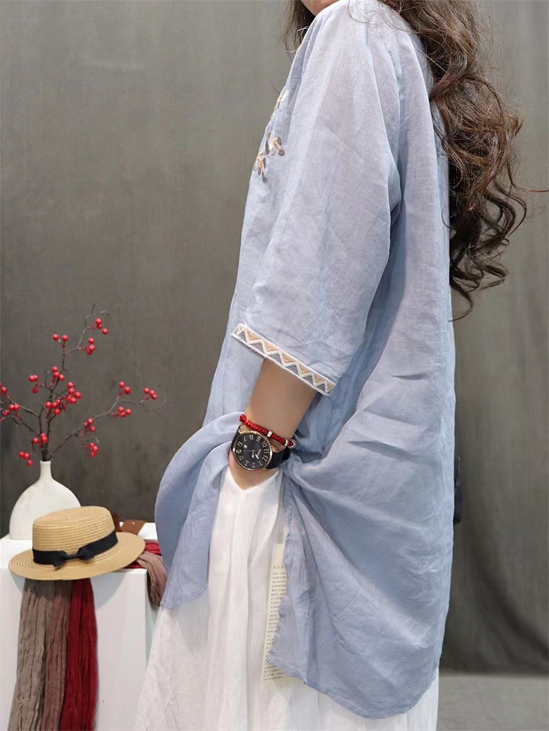 Женская хлопчатобумажная и льняная вышитая кофта в китайском стиле ретро, средняя длина рукава, тонкая, весна-лето-осень 2025 года