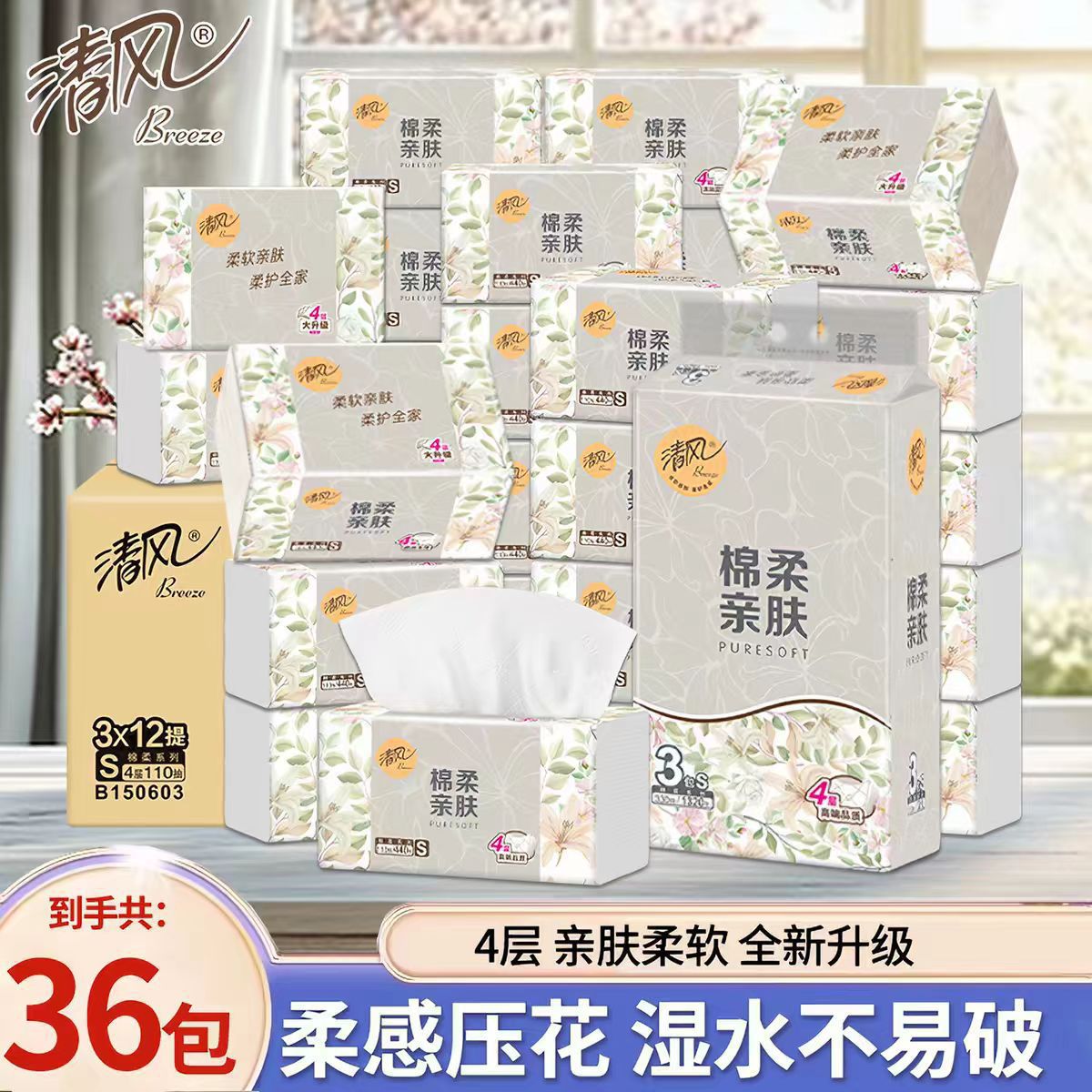 Супервыгодный набор из четырех слоев, 110 штук [3 упаковки]; Супервыгодный набор: четырехслойные салфетки, 110 штук [6 упаковок]; Супервыгодный набор: четырехслойные салфетки, 110 штук [36 упаковок]