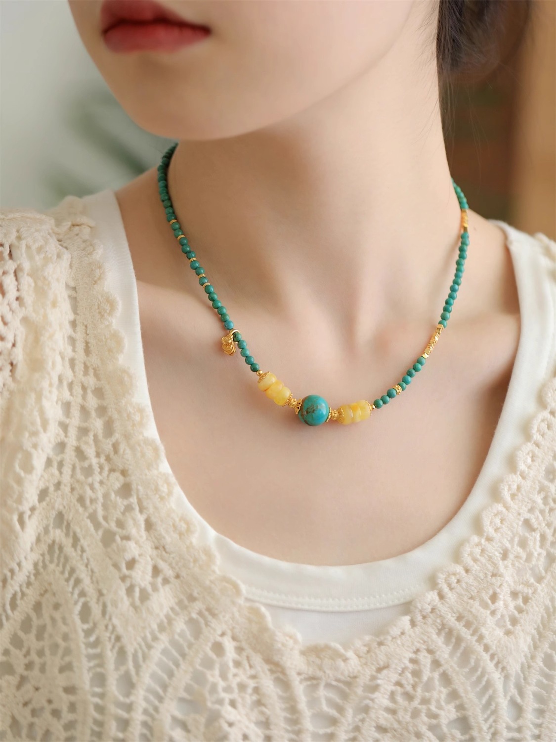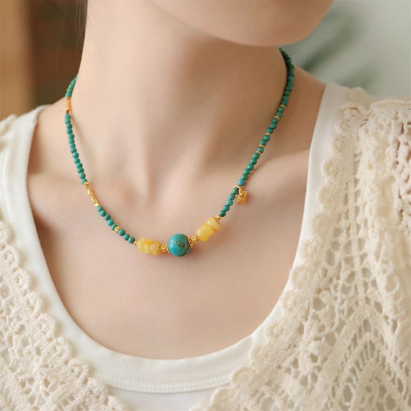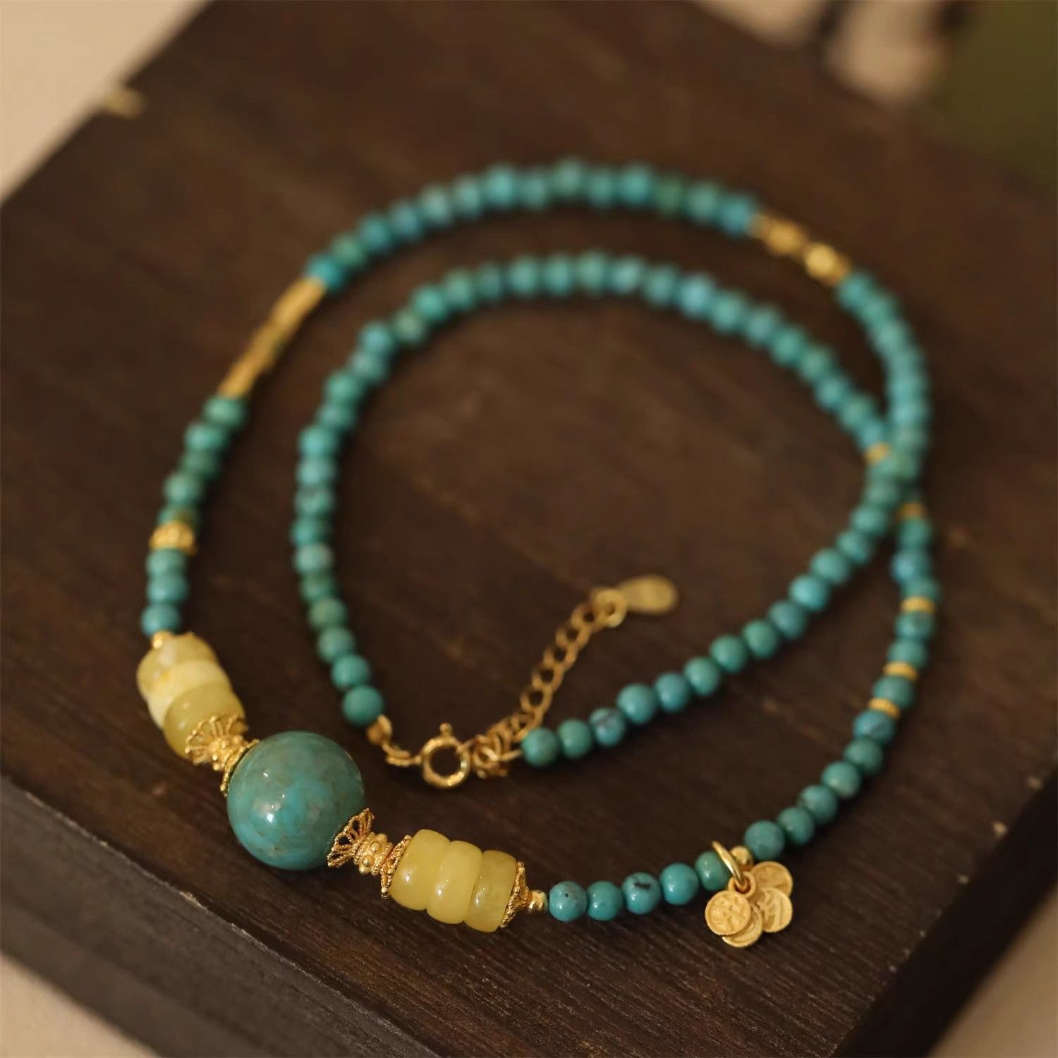 Цепочка на ключицу, мир и радость, дизайн в китайском стиле, ожерелье из бисера, пчелиный воск, бирюза, золото, абакус, новый китайский стиль, сломанное серебро