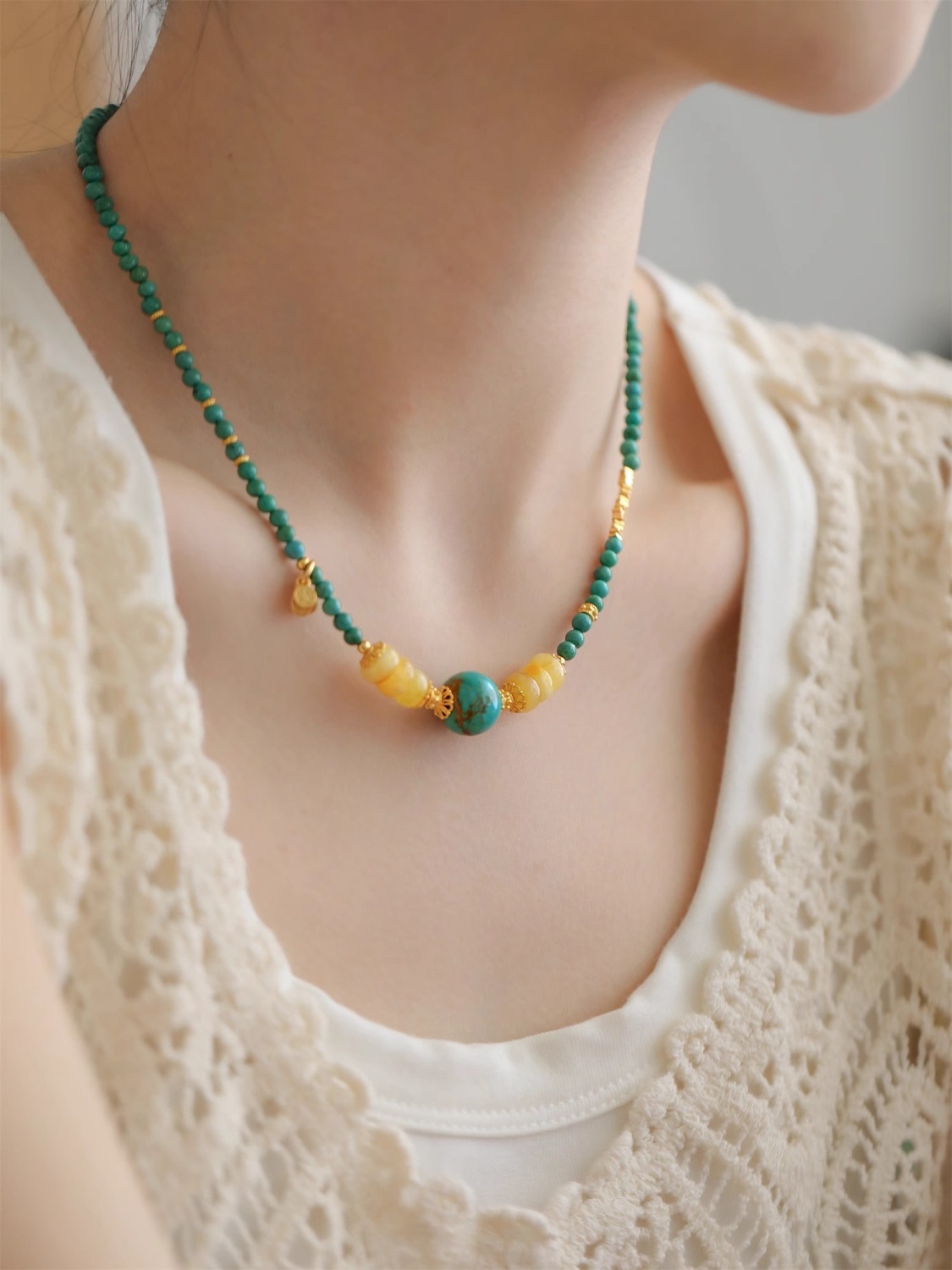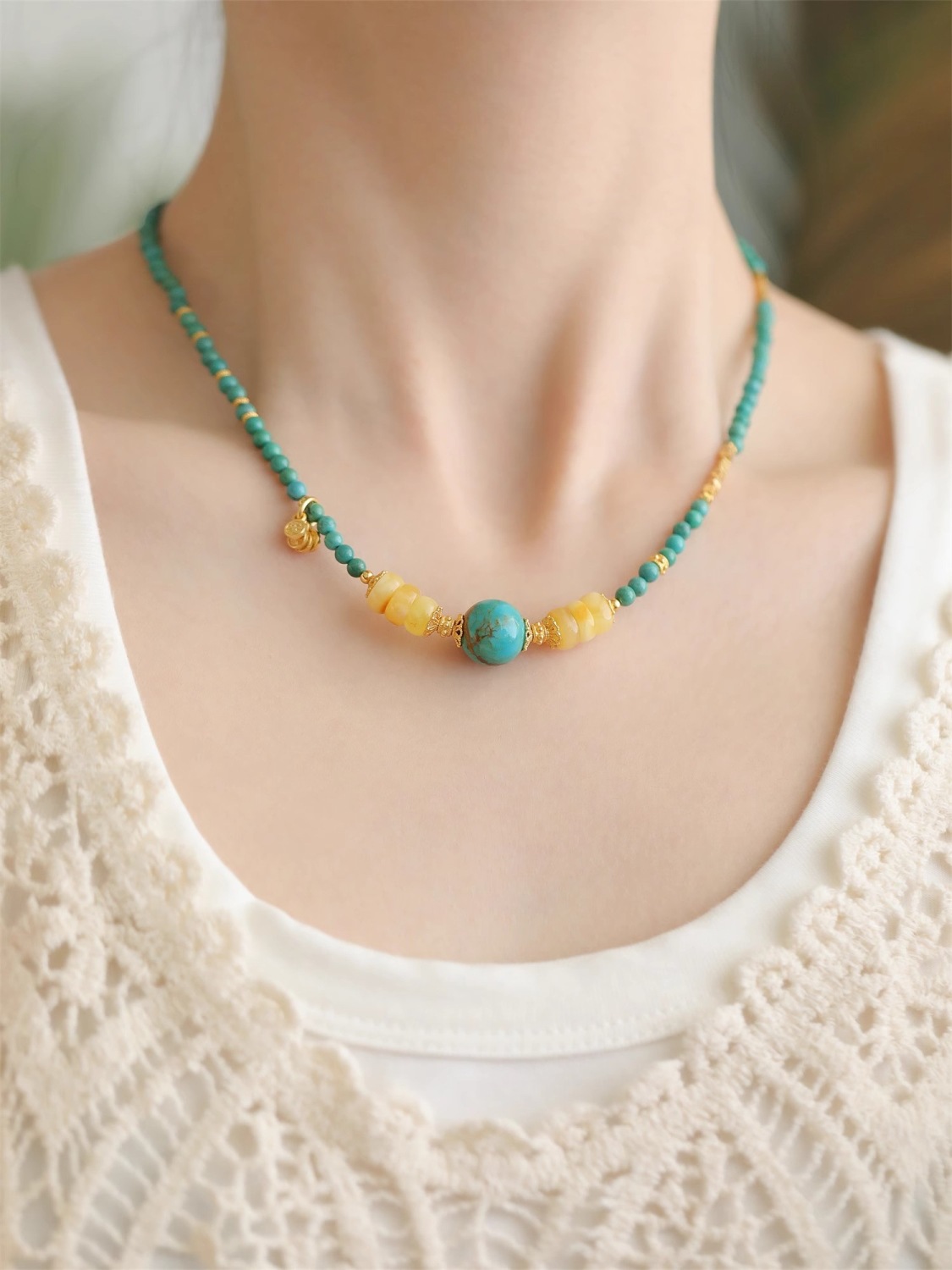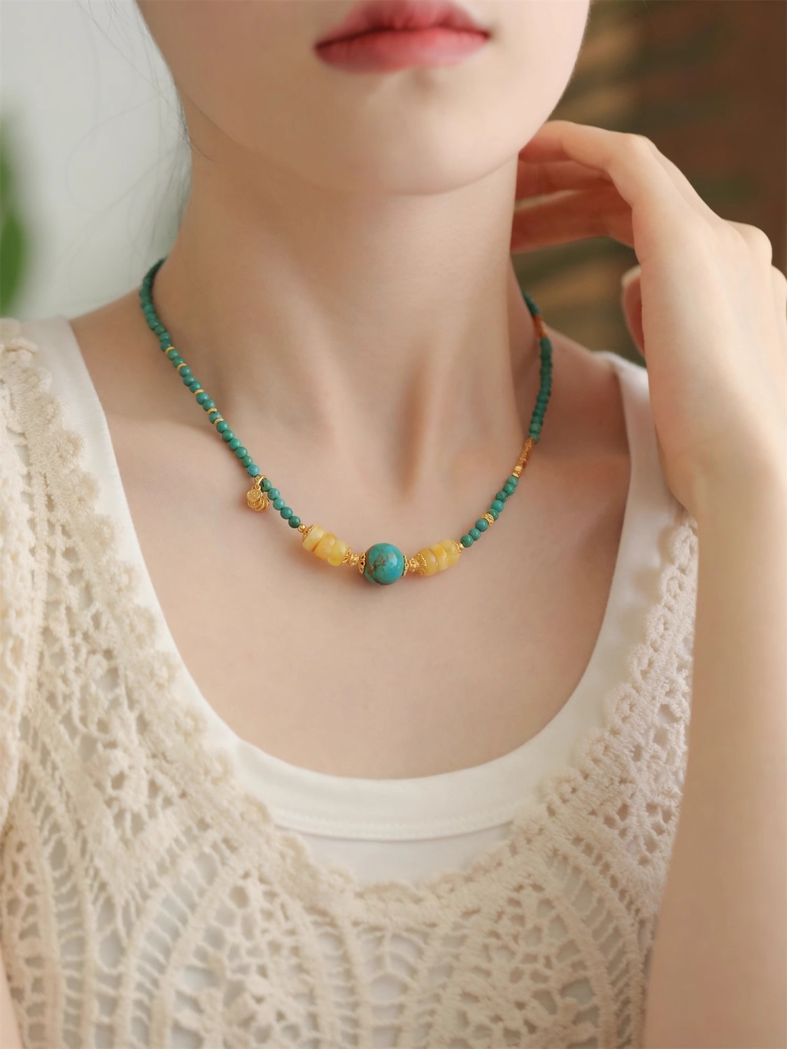 Цепочка на ключицу, мир и радость, дизайн в китайском стиле, ожерелье из бисера, пчелиный воск, бирюза, золото, абакус, новый китайский стиль, сломанное серебро