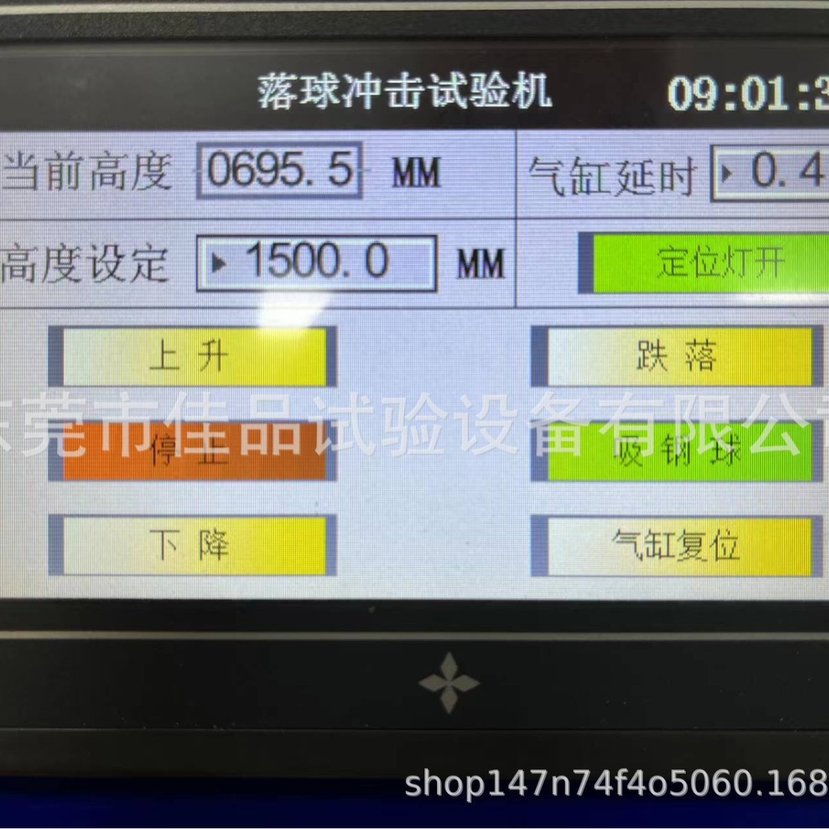 本机采用触摸屏+PLC控制、可在触摸屏内设定:上升、下降、跌落次数、可控制红外激光对准钢球冲击部位、可以显示已测试的次数、当前高度值等.