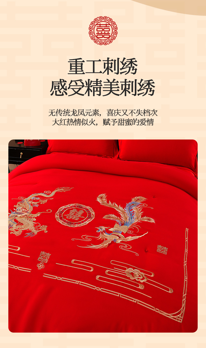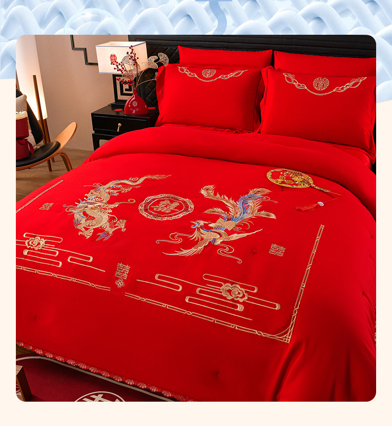 Счастливое одеяло — Дракон и Феникс олицетворяют благоприятность; Счастливое одеяло - счастливая семья; Счастливое одеяло — Дракон, парящий в небе, и Феникс, прыгающий; Счастливое одеяло — идеальное сочетание; Счастливое одеяло – Божественный матч; Счастливое одеяло – счастливый брак