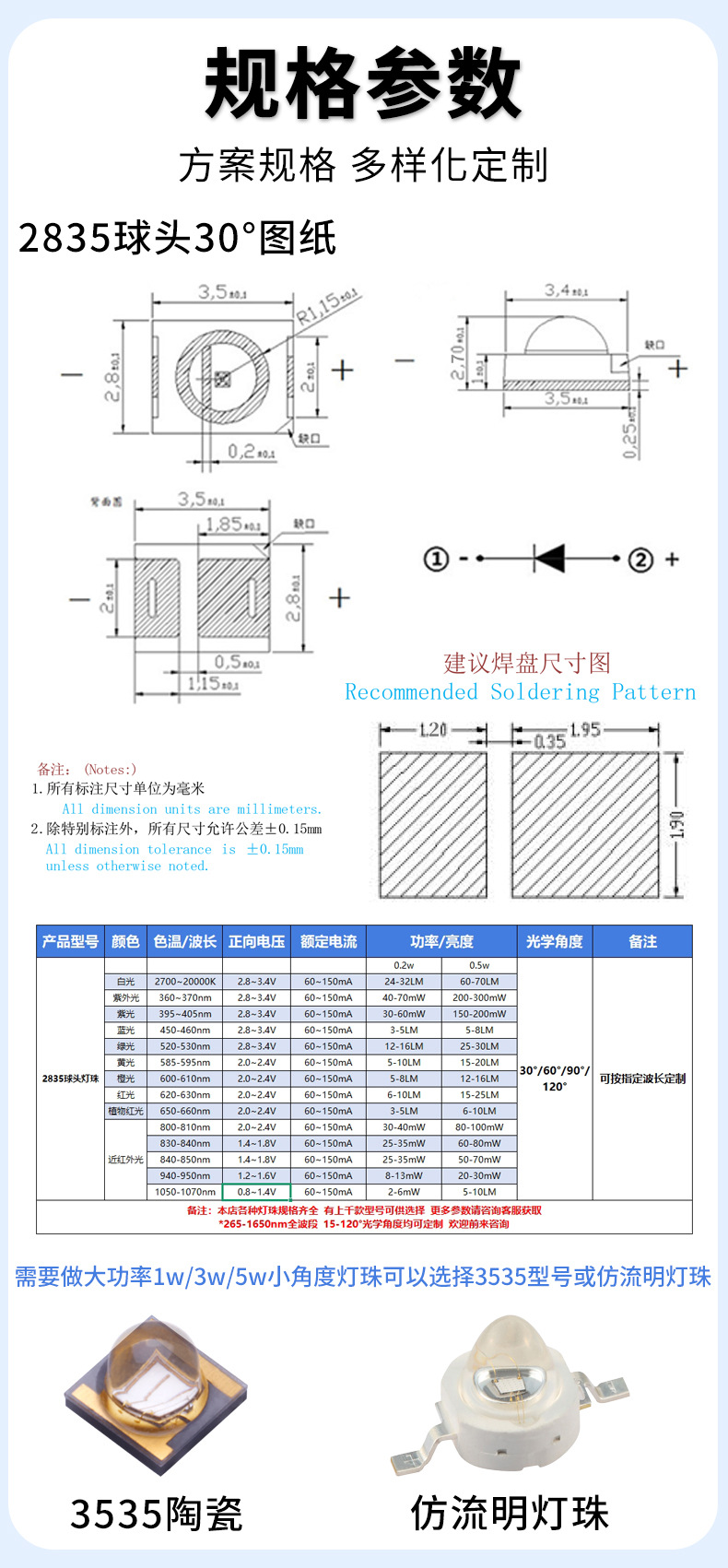 2835 шаровая головка белого света 0,2 Вт; 2835 шаровая головка белого света 0,5 Вт; 2835 шаровая головка фиолетовый свет 0,2 Вт; 2835 шаровая головка синий свет 0,2 Вт; 2835 шаровая головка синий свет 0,5 Вт; 2835 шаровая головка зеленый свет 0,2 Вт; 2835 шаровая головка зеленый свет 0,5 Вт; 2835 шаровая головка красный свет 0,2 Вт; 2835 шаровая головка красный свет 0,5 Вт; 2835 шаровая головка, зеленый свет, 500 нм/14 мил; 2835 шаровая головка желтого света 590 нм/10 мил; 2835 шаровая головка желтого света 590 нм/14 мил; 2835 шаровая головка растение красный 660нм/10МИЛ; 2835 шаровая головка растение красный 660нм/14МИЛ; 2835 шаровая головка темно-красная 730 нм/10 мил; 2835 шаровая головка темно-красная 730нм/14МИЛ; 2835 шаровая головка инфракрасная 850 нм/10 мил; 2835 шаровая головка инфракрасная 850 нм/14 мил; 2835 шаровая головка инфракрасная 850 нм/20 мил; 2835 шаровая головка инфракрасная 940 нм/10 мил; 2835 шаровая головка инфракрасная 940 нм/14 мил; 2835 шаровая головка инфракрасная 940 нм/20 мил; 2835 шаровая головка инфракрасная 1060 нм/14 мил