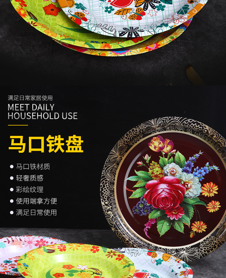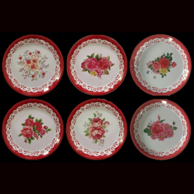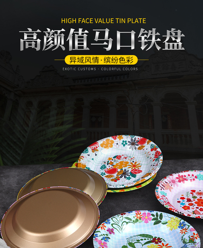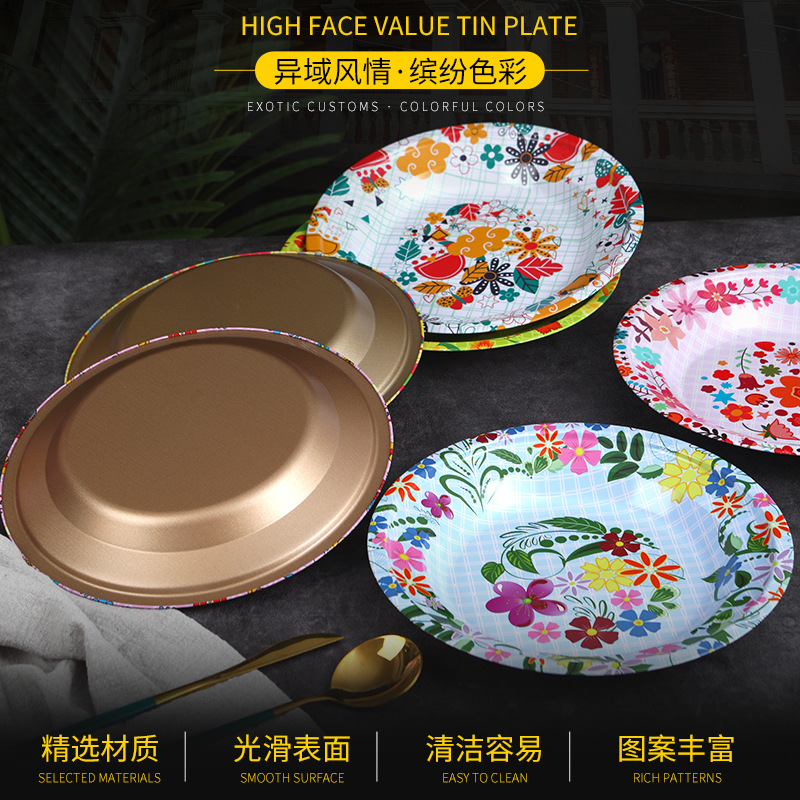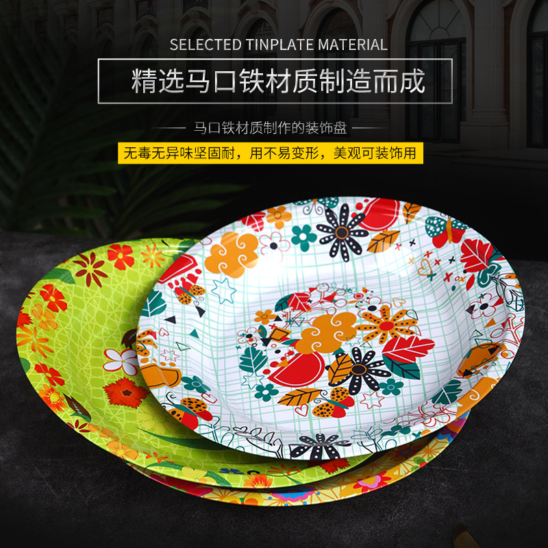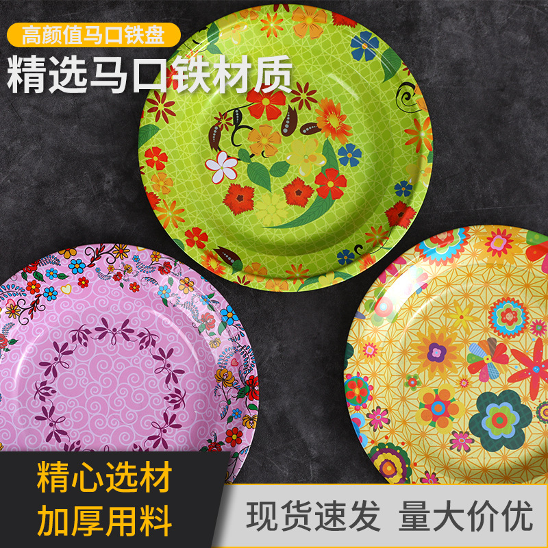 Производитель оптом Юго-Восточной Азии печатные железные тарелки цветные круглые жёстые тарелки ретро посуда
