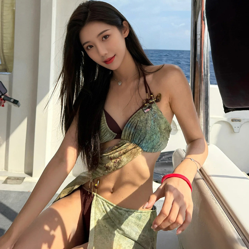 Трансграничная корейская версия горячих источников 2025 медовый месяц глубокий V ретро-облегающие бикини набор из трех частей