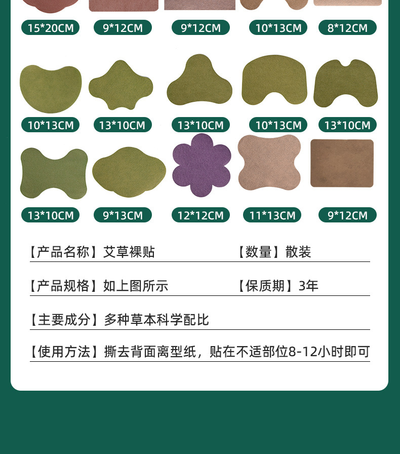 Поясничный пластырь из полыни; Пластырь на шейный позвонок из полыни; наколенник из полыни; Нашивка на плечо из полыни; Пластырь из полыни и имбиря; Пластырь для поясничного позвонка [12 пластырей/пакет]; Пластыри для шейных позвонков [12 пластырей/пакет]; Наклейки на плечи [12 наклеек/пакет]; Патчи на колени [12 пластырей/пакет]