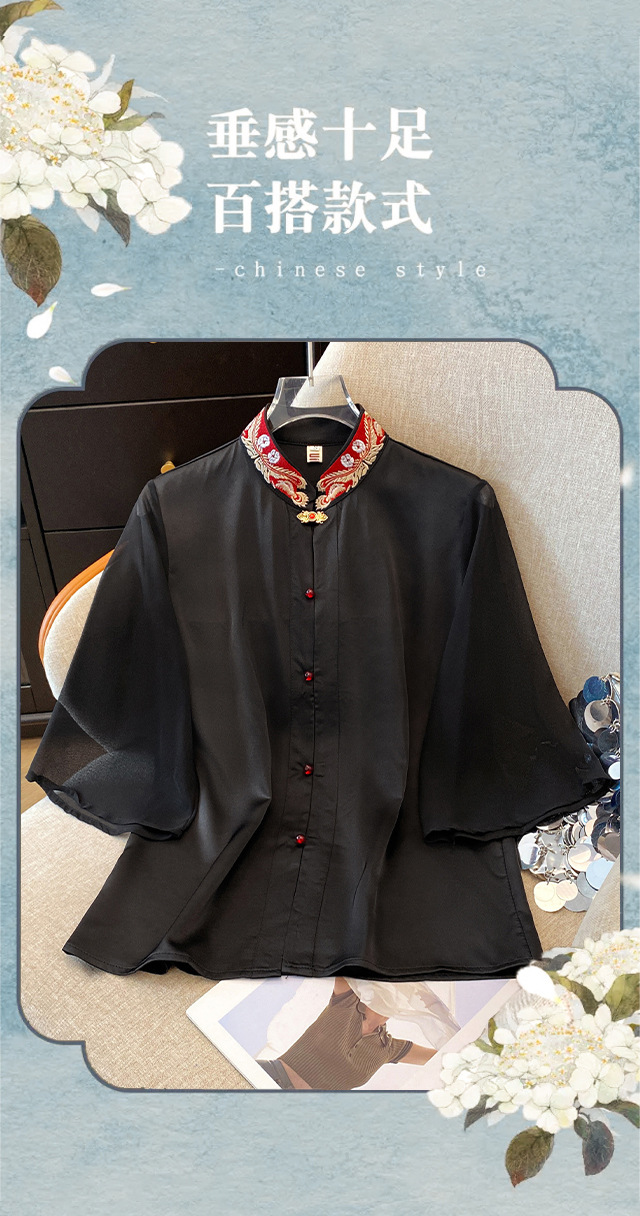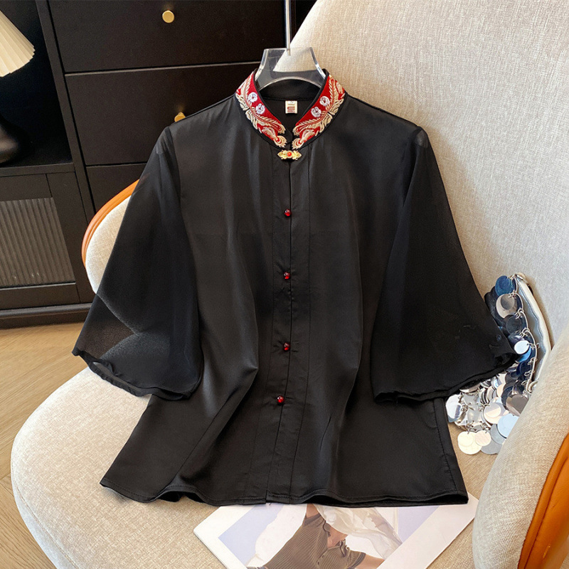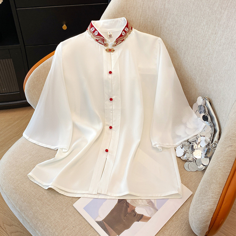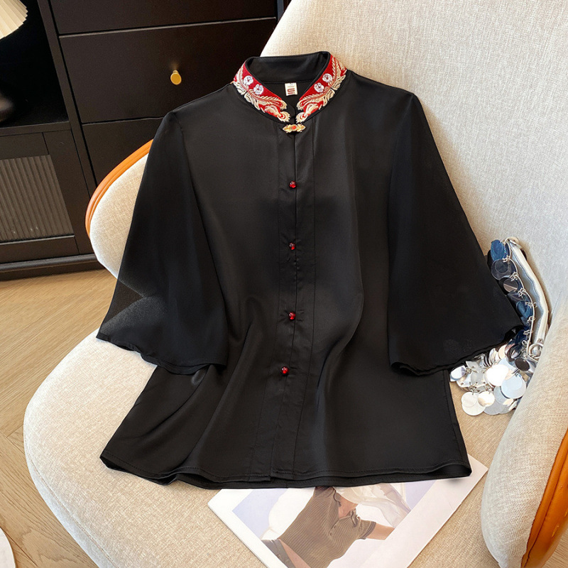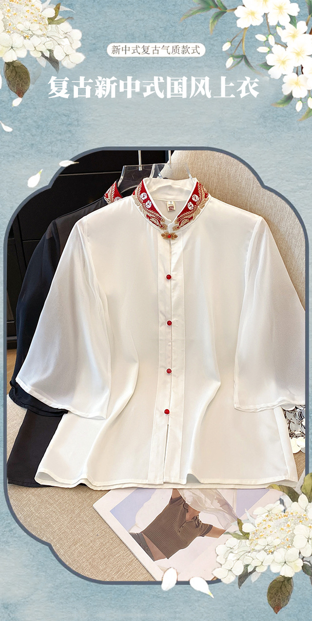 Лето 2025, новый улучшенный ретро-новый китайский стиль, национальный стиль, воротник-стойка, рукава в форме листьев лотоса, универсальный свободный утягивающий топ с вышивкой