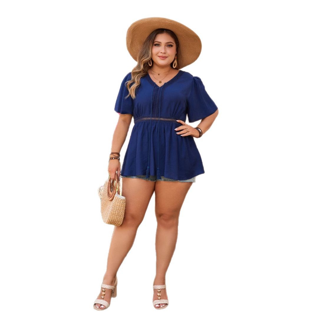 Трансграничная европейская и американская женская одежда большого размера 2025 внешняя торговля повседневная свободная рубашка с короткими рукавами с V-образным вырезом с короткими рукавами топ с высокой талией с принтом