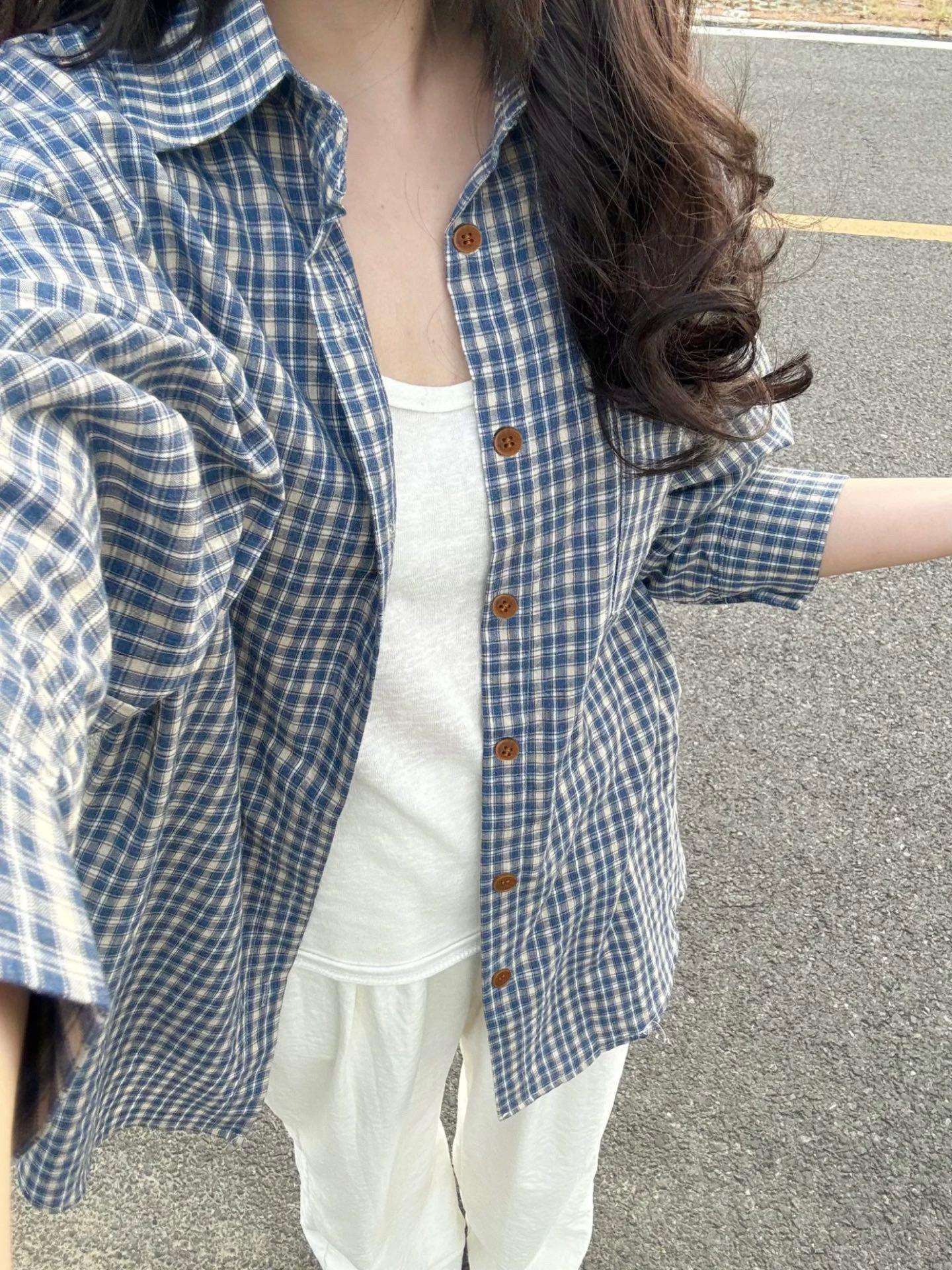 Сине-белая клетчатая повседневная клетчатая рубашка с длинными рукавами для женщин, летняя тонкая свободная солнцезащитная рубашка, топ в ленивом стиле, куртка