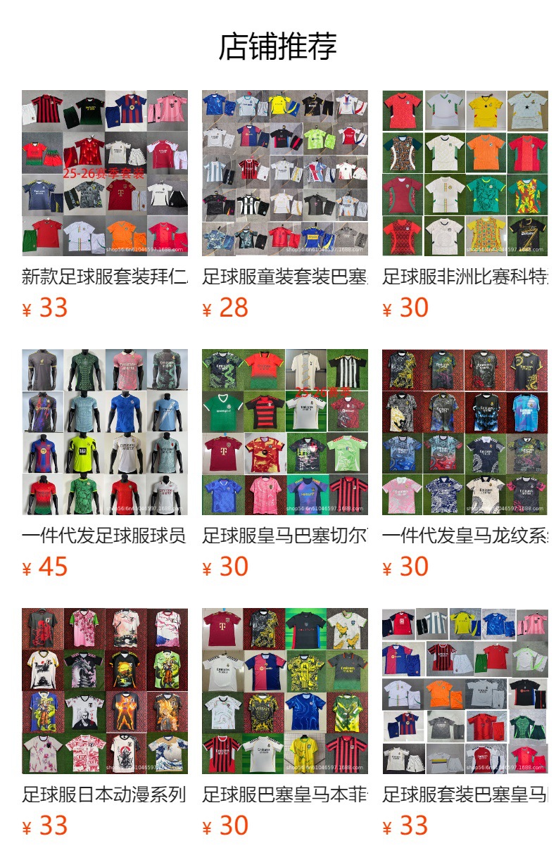 22-23 Порто в гостях; 25-26FC Зальцбург; 25-26 Боливия Господь; 25-26 Специальное издание Неймара; 2526 Памятное издание Месси; 2526C Ronaldo, памятное издание; 2526Вратарь «Арсенала»; 2526 Парижский домашний корт; 2526, немецкое издание, посвященное 125-летию; 2526 Синий вратарь Реал Мадрид; 2526 Реал Мадрид, год змеи; 2526 Америка Специальное издание; Специальное издание «Барселона» 1; Специальное издание Real Madrid Blue; Специальное издание Реал Мадрид 1; Одежда для тренировок «Барселона» с розовым драконом; Специальное издание Барселоны 6; 24-25 Париж три игры в гостях; 2526 Барселона, домашний корт; 125-летие Барселоны; Розовое Италия Памятное издание; Розовая Италия, специальное издание; 25-26 Тренировочная форма Барселоны; 24-25 красная тренировочная форма «Интер Милан»; 2526 Баса Белый Специальное издание; Мемориальное издание «Интер Милан» года Змеи, желтое; черный бразилианский; Реал Мадрид лотос розовый узор дракона; Реал Мадрид лотос черный дракон узор; Реал Мадрид, черный золотой узор в виде дракона; Реал Мадрид роза красный дракон узор; 2526 Бавария Концептуальное издание; Тренировочная форма Барселоны розового цвета; Тренировочная форма Барселоны синяя; Тренировочная форма Барселоны розово-красная; Бразильский цвет; 24-25 розовая тренировочная форма Реал Мадрид; Тренировочная форма альжирского розового цвета.; Алжир – выездная игра; Алжир домой; Арсенал Черный Специальное Издание; Памятное издание Barcelona Gold Label; Тренировочная форма Барселона белая; Специальное издание «Реал Мадрид» серо-красного цвета; Реал Мадрид, светло-голубой, специальное издание; Реал Мадрид, светло-голубо-красный, специальное издание; Португальский шафран, специальное издание; Королевский конь с узором зеленого дракона; Реал Мадрид с узором «Белый дракон»; Реал Мадрид, черный дракон, узор; Реал Мадрид, розовый узор с драконом; Португальское сотрудничество; Бразильский белый ге; Бразильский желтый; 2526 Майами, красочное специальное издание; Кебаси; Джерси «Астон Вилла» в гостях; 25-26 Версия пива «Бавария абрикос».; Специальное издание «Ноттингем Форест»; Совместная версия Yuantouren красного и синего цвета; Итальянская концептуальная версия белой тренировочной формы; Итальянская концептуальная версия синей тренировочной формы