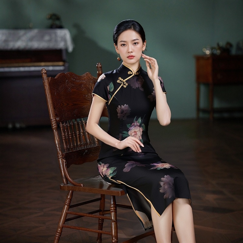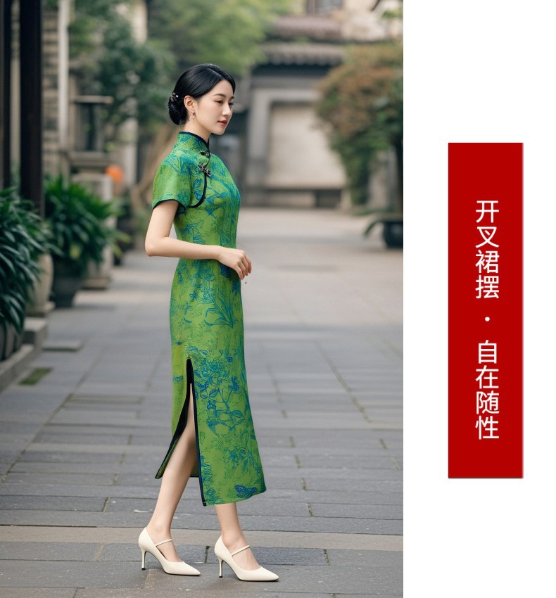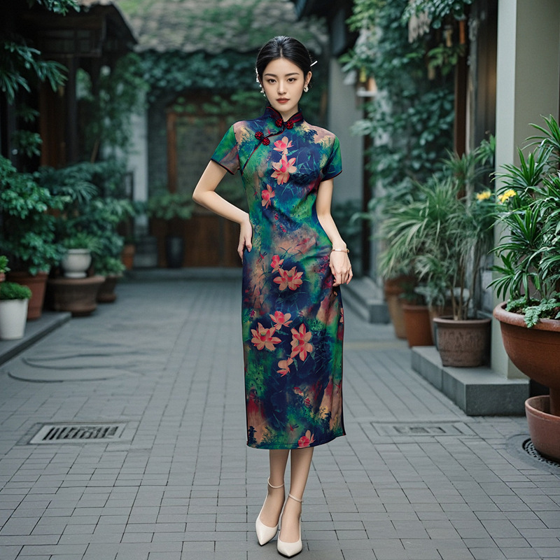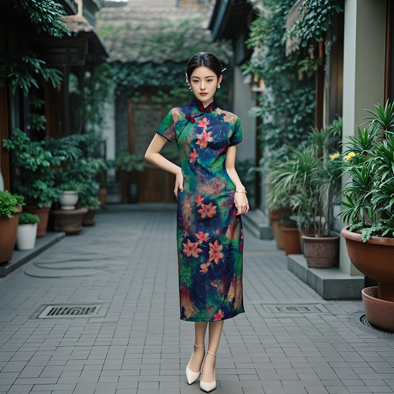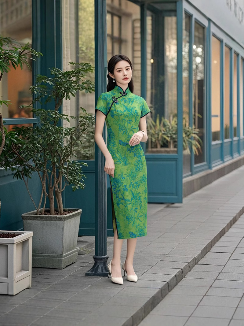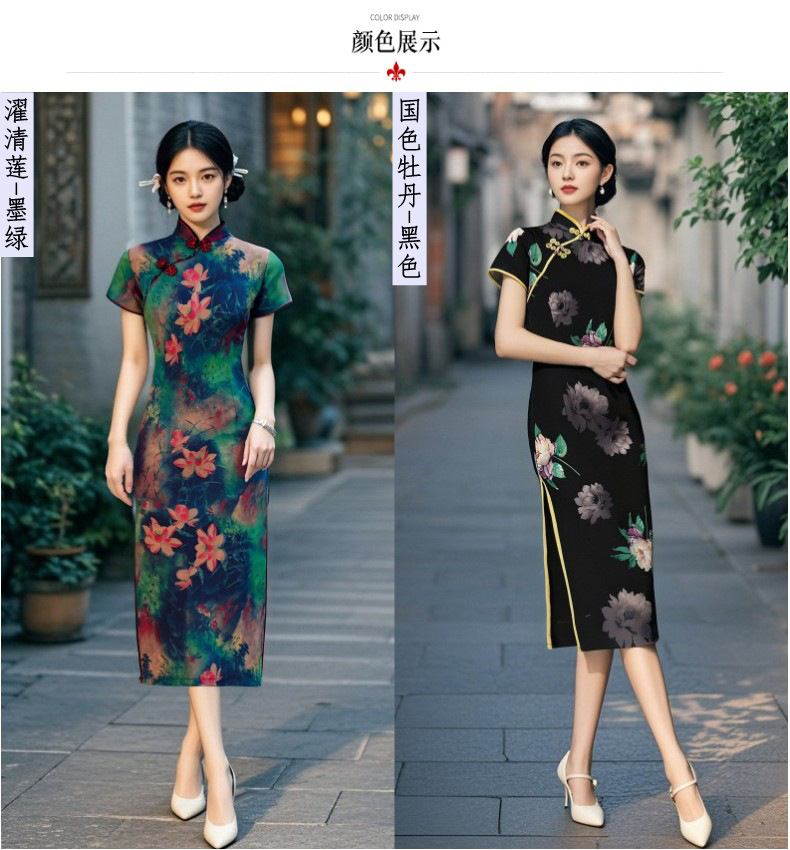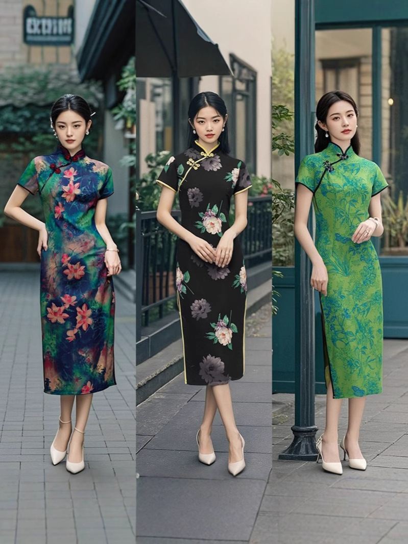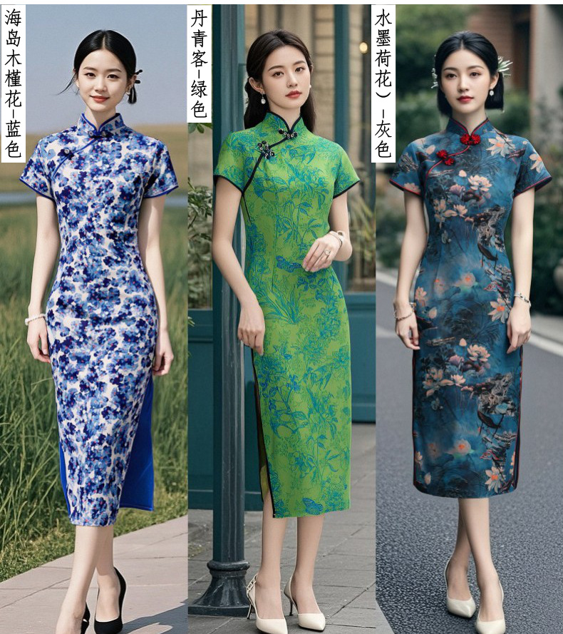 Длинный чонсам с короткими рукавами (национальный цвет пион) - черный; Длинный чонсам с короткими рукавами (Данцинке) - зеленый; Длинный чонсам с короткими рукавами (Чжоу Цинлянь) — темно-зеленый.; Длинный чонсам с короткими рукавами (чернильный лотос) - серый; Длинный чонсам с короткими рукавами (Остров Гибискус) - синий