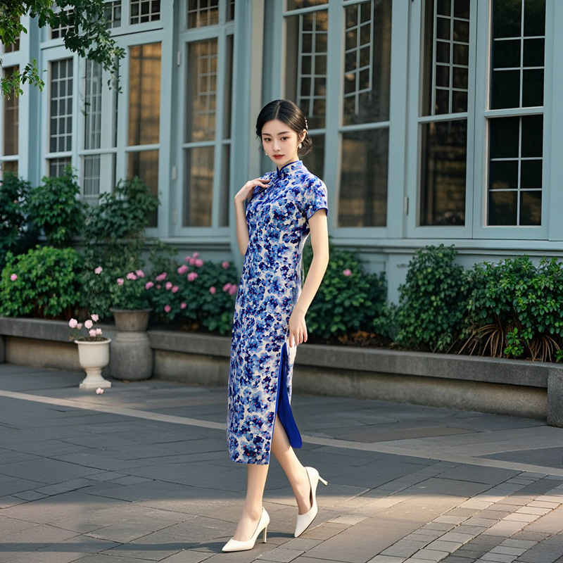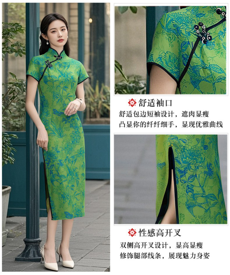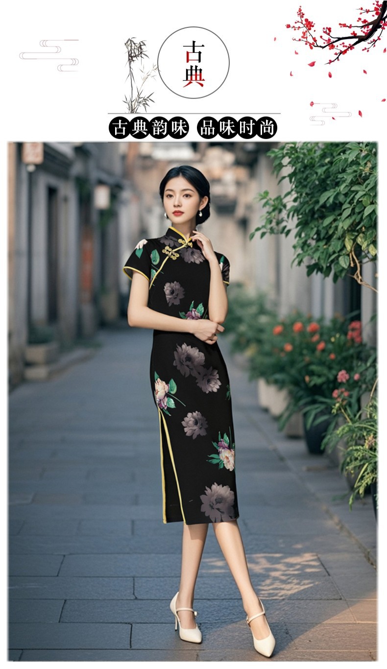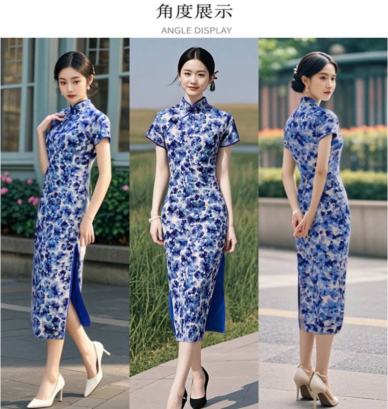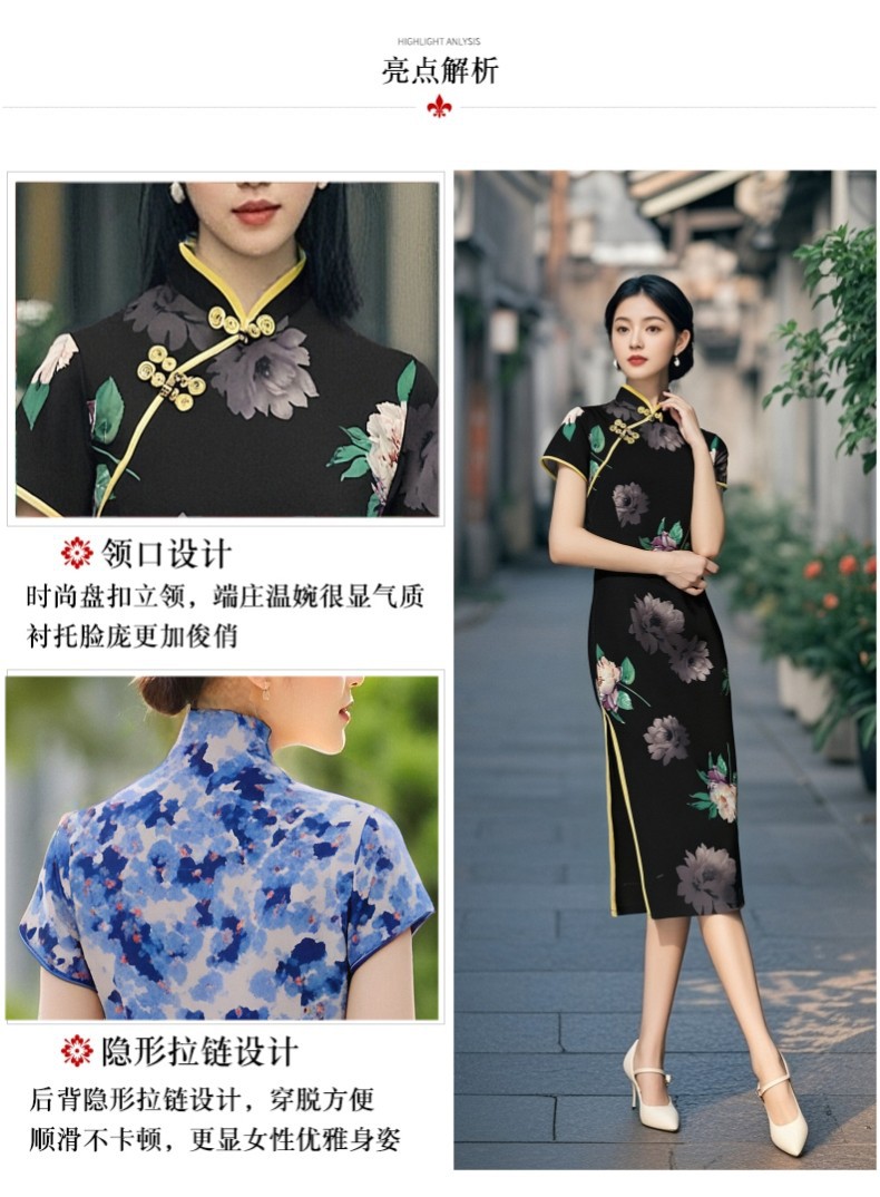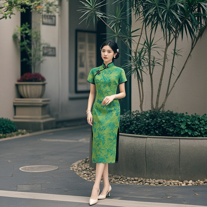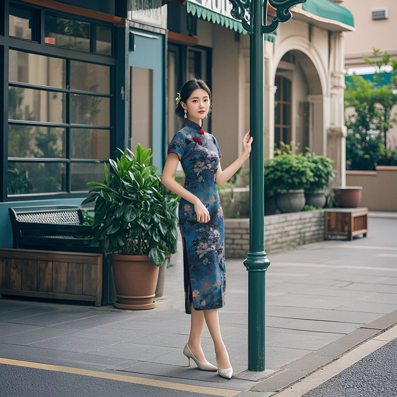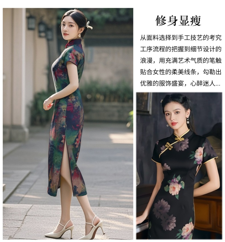 Длинный чонсам с короткими рукавами (национальный цвет пион) - черный; Длинный чонсам с короткими рукавами (Данцинке) - зеленый; Длинный чонсам с короткими рукавами (Чжоу Цинлянь) — темно-зеленый.; Длинный чонсам с короткими рукавами (чернильный лотос) - серый; Длинный чонсам с короткими рукавами (Остров Гибискус) - синий