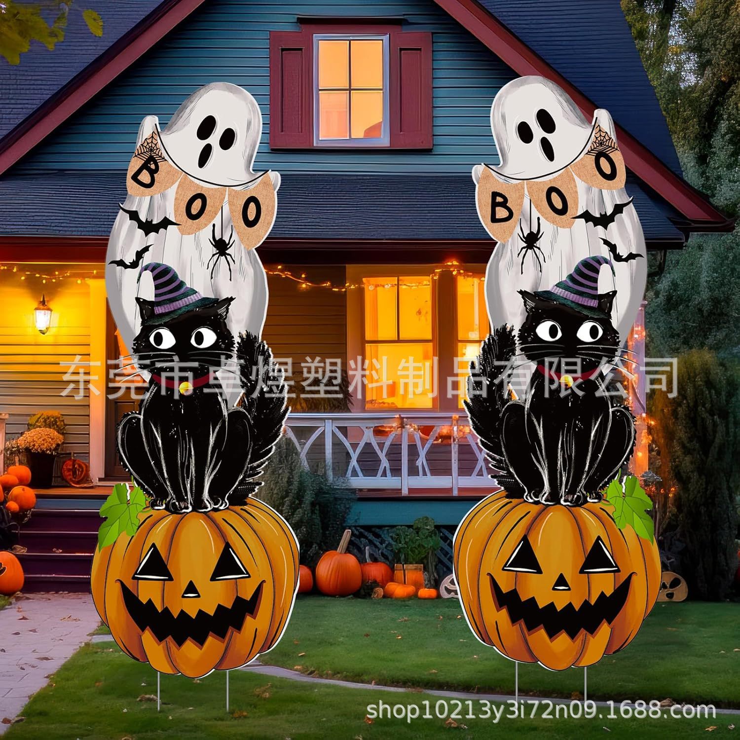 万圣节装饰户外荧光南瓜幽灵脸和女巫帽草坪标志恐怖前院塑料装饰