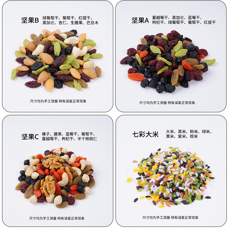 Кофейные зерна (1 г); Шоколадный конус (1 г); Чистые белые семена лотоса (1 г); Крашение семенами лотоса (1г); Зеленый изюм (1 г); Сухофрукты (1 г); Сушеная черная смородина (1г); Ягоды волчьего плода (1 г); Сушеная черника (1г); Клюква сушеная (1г); Сушеный красный виноград (1г); Сырые орехи кешью (1 г); Спелые орехи кешью (1 г); Сырой арахис (1 г); Арахис (1 г); Красный арахис (1 г); Фундук (1 г); Миндаль (1 г); Миндальное дерево (1г); Ядра грецких орехов с карамелью (1г); Очищенные ядра грецких орехов (1 г); Ядра грецких орехов (1 г); Сушеные соевые бобы (1 г); Влажные соевые бобы (1 г); Черные бобы (1 г); Золотые бобы (1г); Соевые бобы (1 г); Зеленый горошек (1 г); Зеленый горошек (1 г); Зеленый горошек (1 г); Горох (1 г); Мунг-фасоль (1 г); Мини-красная фасоль (1 г); Натто (1 г); Красная фасоль длинная (1 г); Крупная красная фасоль (1 г); Красная фасоль (1 г); Зерна пшеницы (1 г); Масличные зерна кукурузы (1 г); Кукурузные зерна (1 г); Красные финики (1 г); Рисовые бусины (1г); Коричневый рис (1 г); Зеленый рис (1 г); Розовый рис (1 г); Желтый рис (1 г); Фиолетовый рис (1 г); Большой белый рис (1 г); Черный рис (1 г); Черные семена кунжута (1 г); Белые семена кунжута (1 г); Смешанный черный и белый кунжут (1 г); Каша «Восемь сокровищ» А (1г); Осьмияровая каша Б (1г); Каша «Восемь сокровищ» С (1г); Каша «Восемь сокровищ» Д (1г); Орех А (1 г); Орех Б (1г); Орех C (1 г); Рис разноцветный (1г); Смешанный изюм (1 г); Маленькие кандидированные финики (1 г); Оригинальный мелкий виноград (1г); Крупный темно-красный виноград (1 г); Черный виноград (1 г); Маленькие каштаны (1 г); Смешанный пакетик из трех маленьких ягод (1 г); Оригинальная смесь темно-красного мелкого винограда (1 г); Зеленый горошек (1 г)
