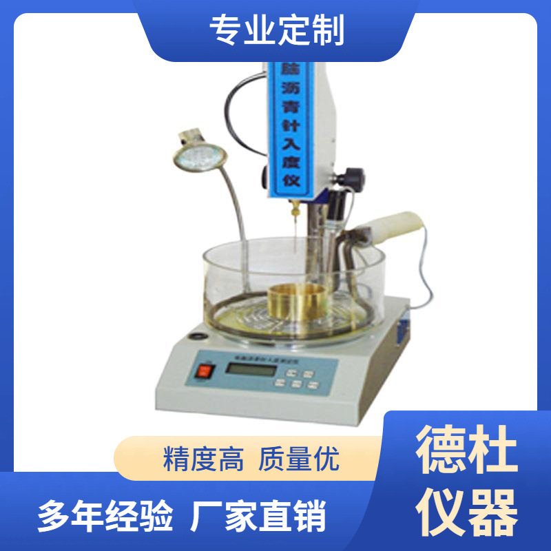 针入度是沥青主要质量指标,表示沥青软硬程度和稠度、抵抗剪切破坏的能力,反映在一定条件下沥青的相对黏度的指标。针入度仪:凡能保证针和针连杆在无明显摩擦下垂直运动,并能指示针贯入深度准确至0.1mm的仪器均可使用。针和针连杆组合件总质量为50克,另附50克砝码一只,试验时总质量为100克。仪器设有放置平底玻璃保温皿的平台,并有调节水平的装置,针连杆应与平台相垂直。仪器设有针连杆制动按钮,使针连杆可自由下落。针连杆易于装拆,以便于检查其质量。仪器还设有可自由转动与调节距离的悬臂,其端部有一面小镜或聚光灯泡,借以观察针尖与试样表面接触情况。当为自动针入度仪时,各项要求与此项相同,温度采用温度传感器测定,针入度值采用位移计测定,并能自动显示或记录,且应对自动装置的准确性经常校验。为提高测试精密度,不同温度的针入度试验宜采用自动针入度仪来进行。