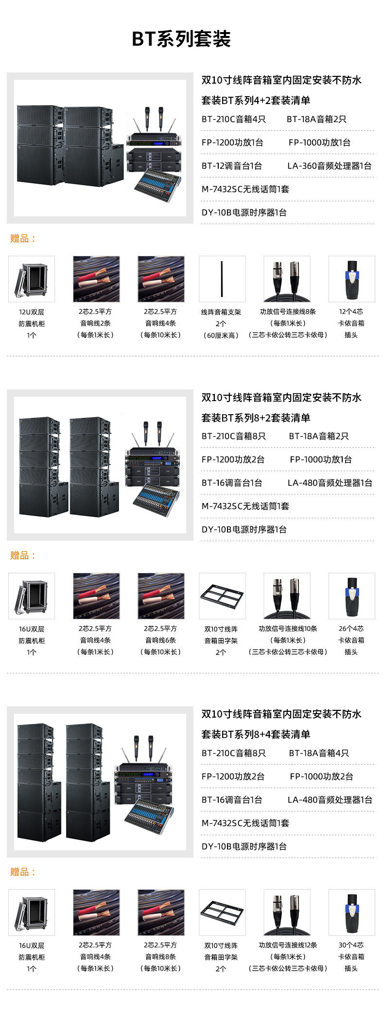 Двойной 10inch-линейный динамик BT-210A; Одиночный басовый динамик с 18inch линейным массивом BT-18A; Двухполосная линейная акустическая система SuitBT серии 4+2; Двухполосная линейная акустическая система серии SuitBT 8+2; Двухполосная линейная акустическая система SuitBT серии 8+4