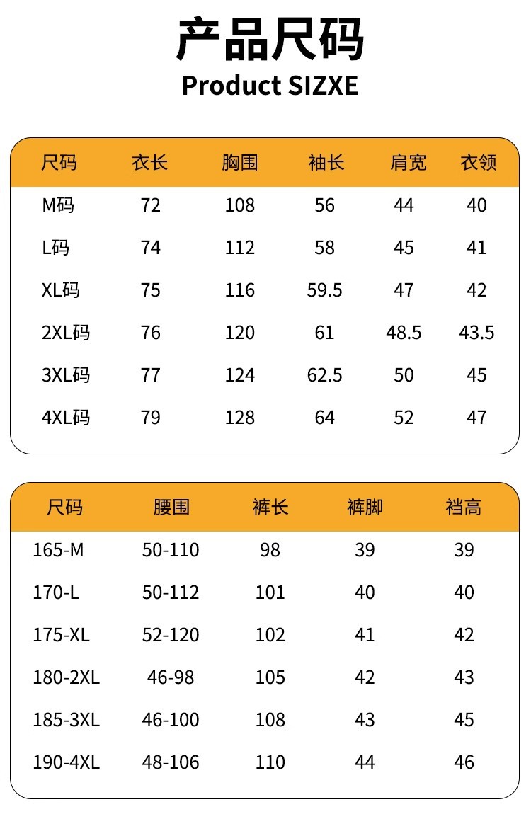 165/M; 170/L; 175/XL; 180/2XL; 185/3XL; 190/4XL