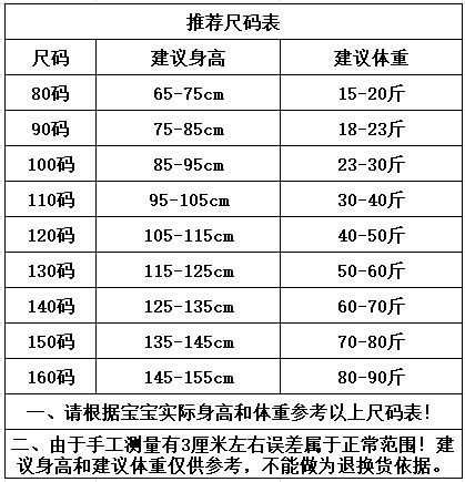 Размер 80 (рекомендуемая высота 65-75 см); Размер 90 (рекомендуемая высота 75-85 см); Размер 100 (рекомендуемая высота 85-95см); Размер 110 (рекомендуемая высота 95-105см); Размер 120 (рекомендуемый рост 105-115см); Размер 130 (рекомендуемый рост 115-125см); Размер 140 (рекомендуемый рост 125-135см); Размер 150 (рекомендуемый рост 135-145см); Размер 160 (рекомендуемый рост 145-155см)