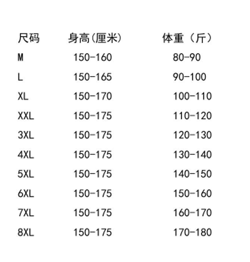 М (40-45kg ); Л (45-50kg ); XL (50-55kg ); XXL (55-60kg ); XXXL (60-65kg ); 4XL ( 65-70kg ); 5XL (70-75kg ); 6XL (75-80kg )