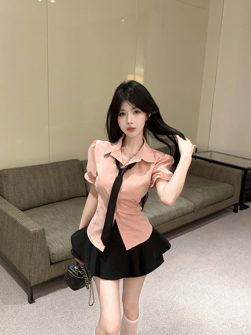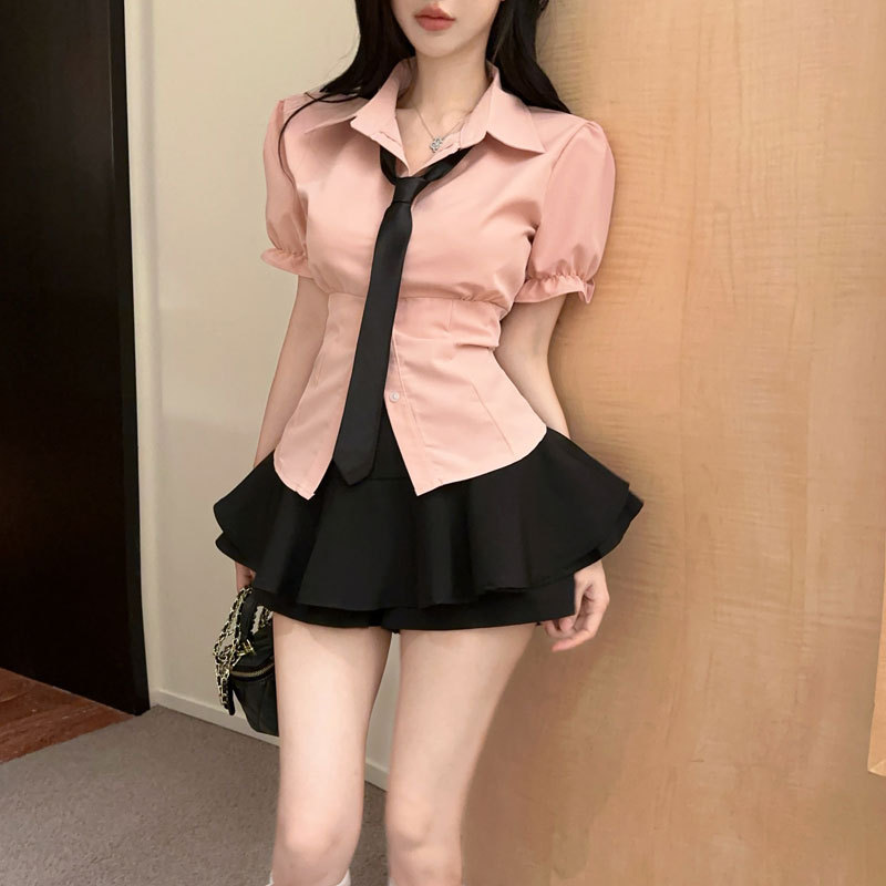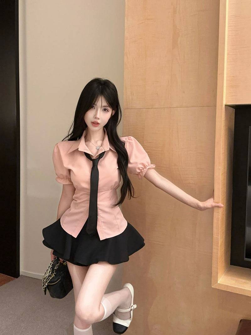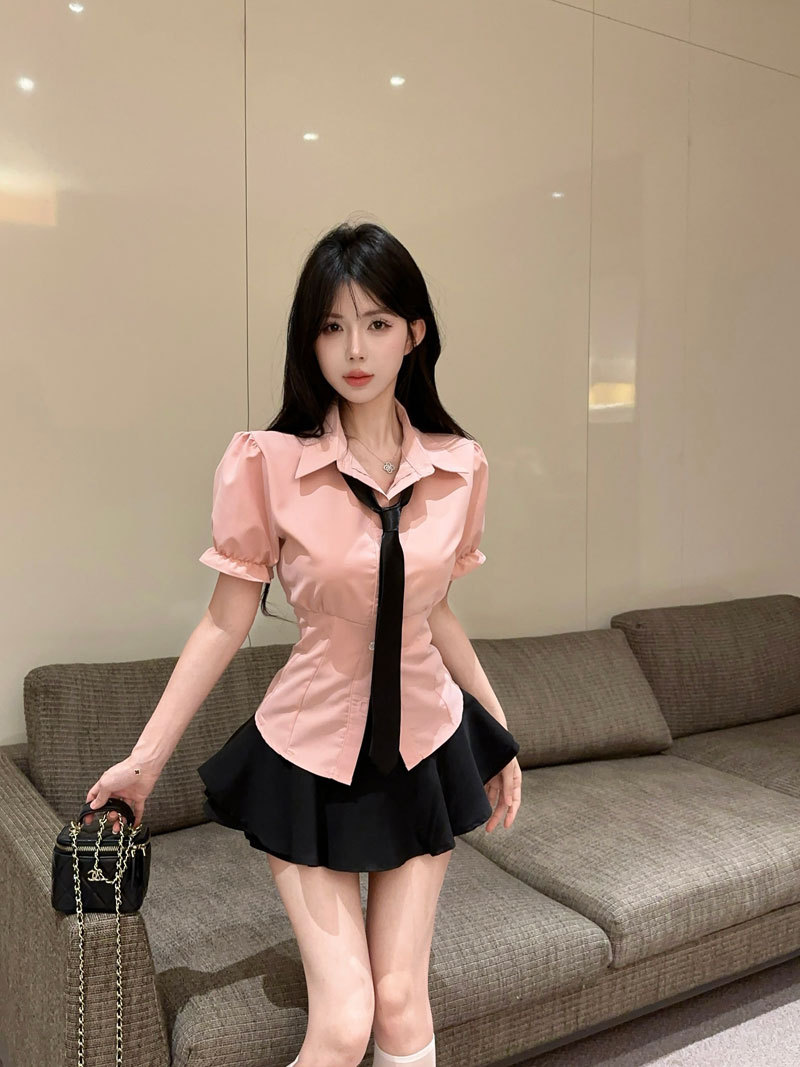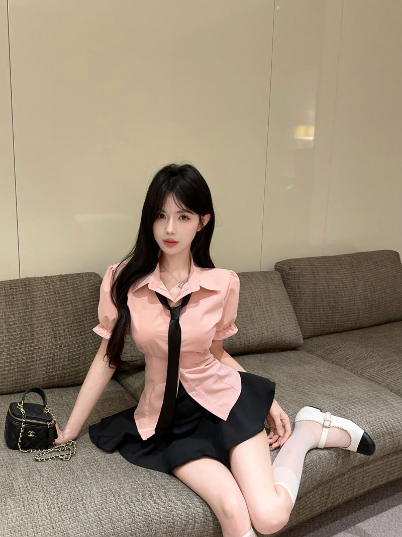 Рубашка с галстуком; черные брюки-кюлоты; Рубашка с галстуком + черные брюки и юбка