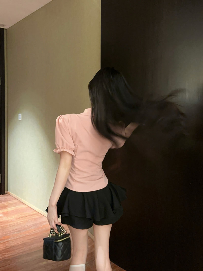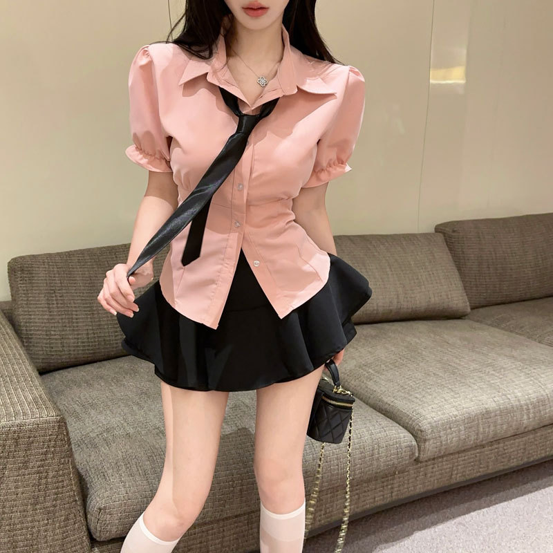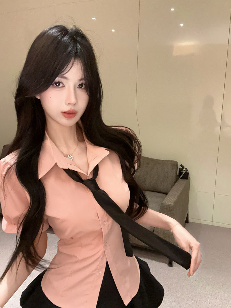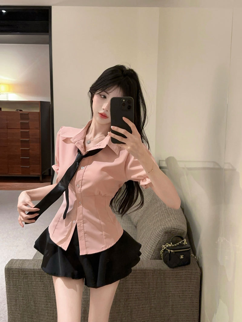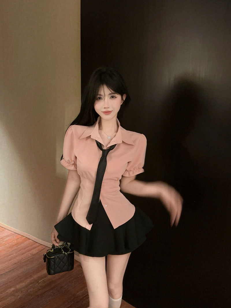 Рубашка с галстуком; черные брюки-кюлоты; Рубашка с галстуком + черные брюки и юбка
