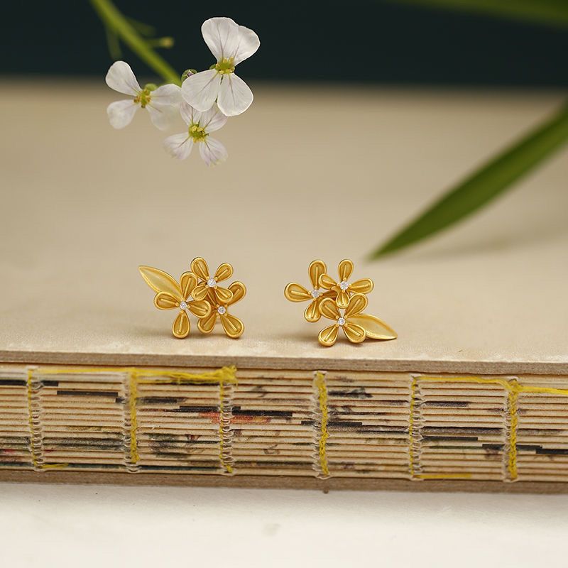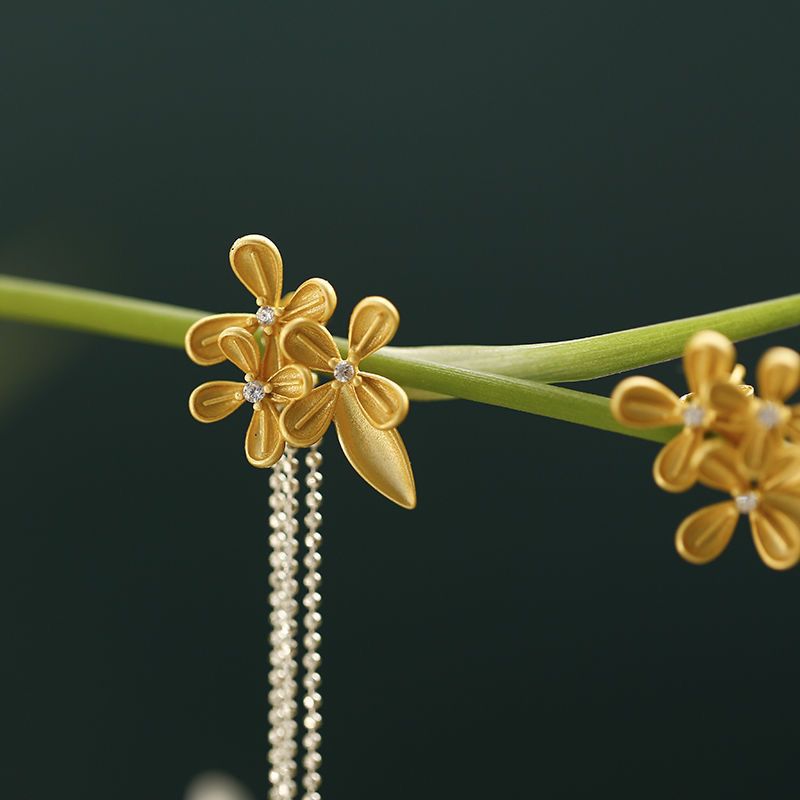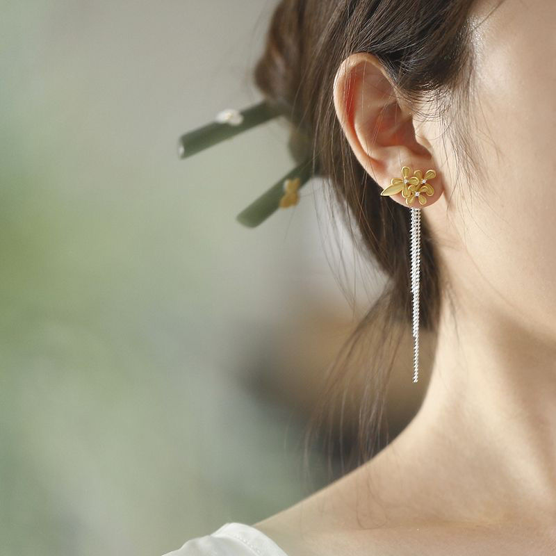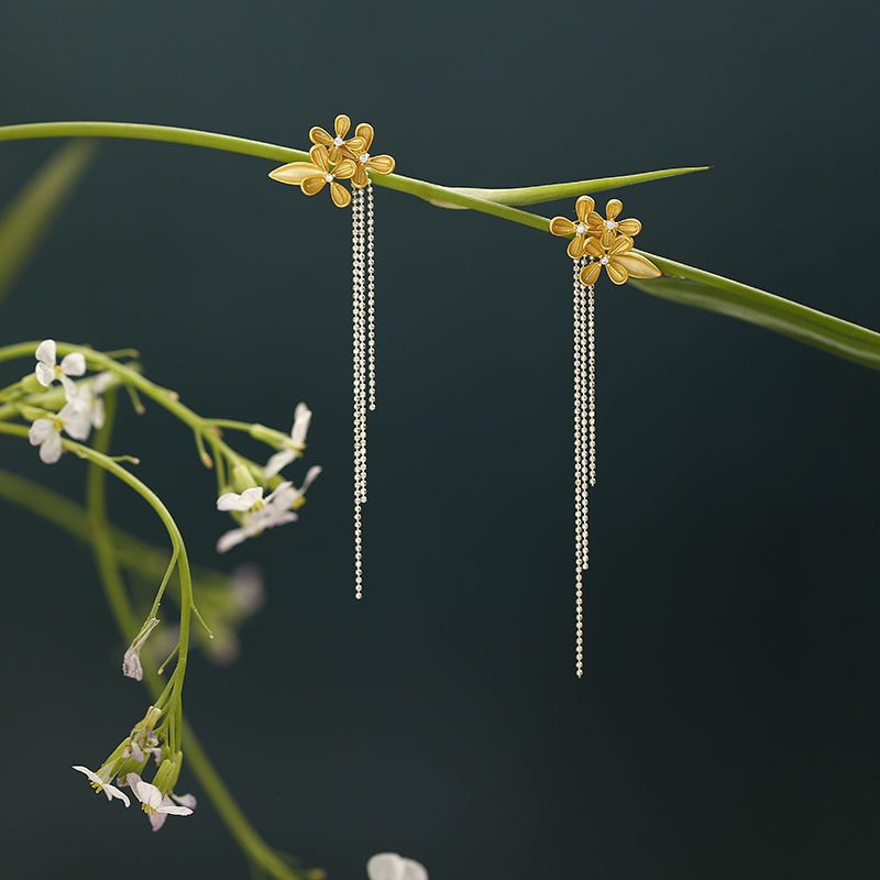 Dewy Laurel Soft Whisper Художественный классический стиль Серебряные позолоченные серьги Osmanthus Rain Длинные универсальные серьги с кисточками.