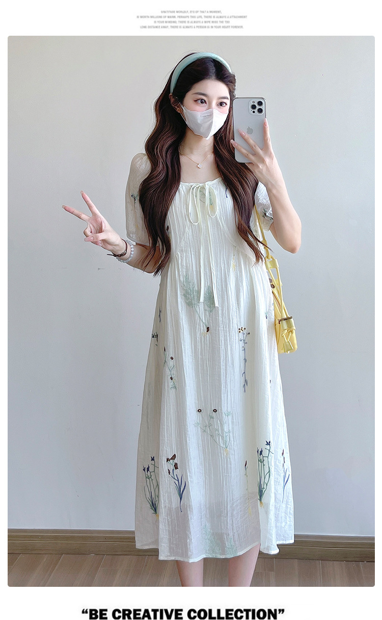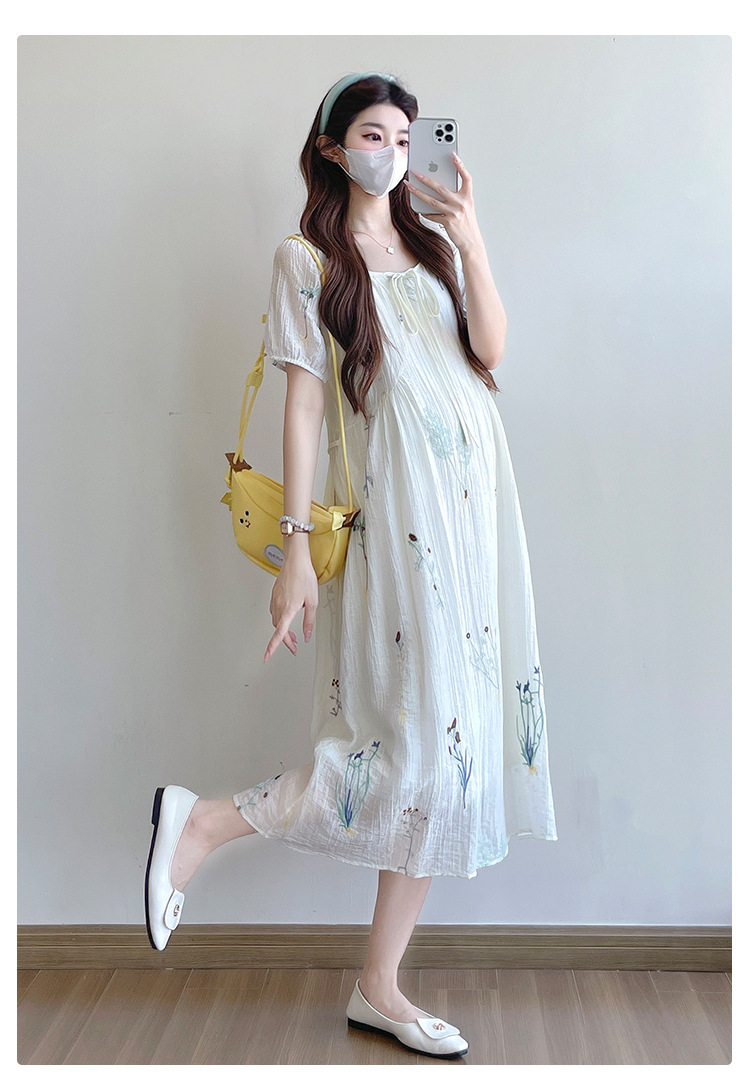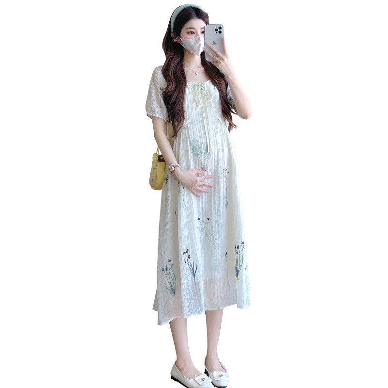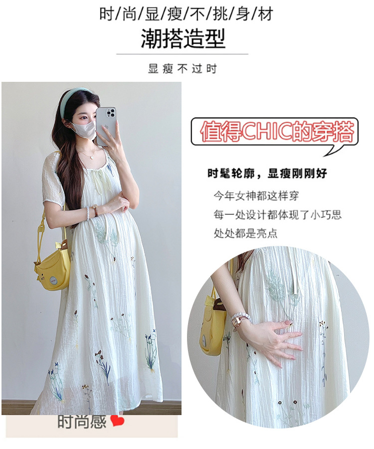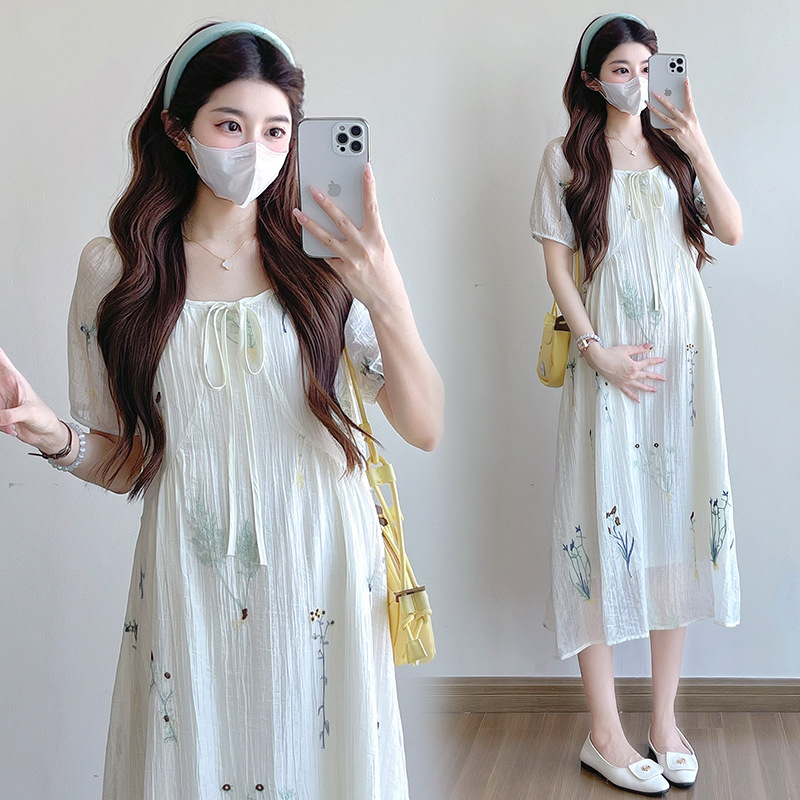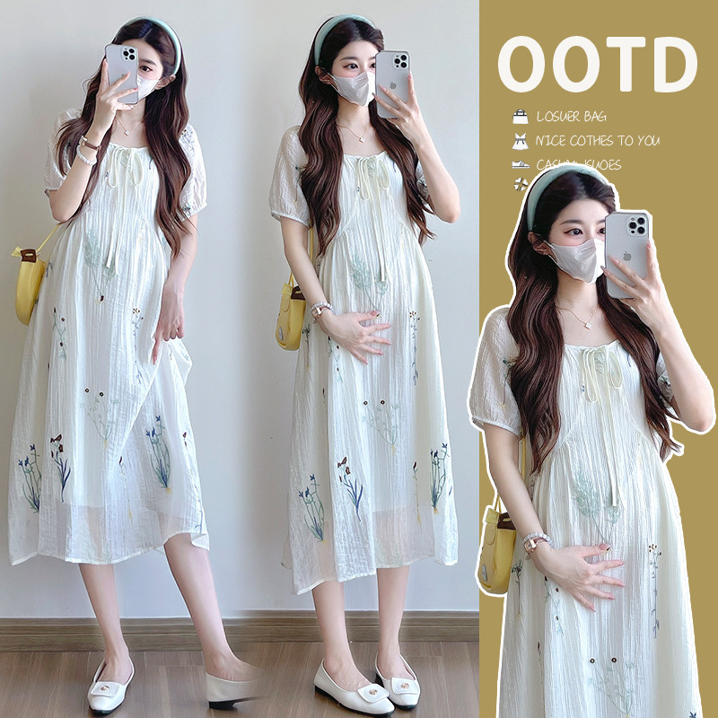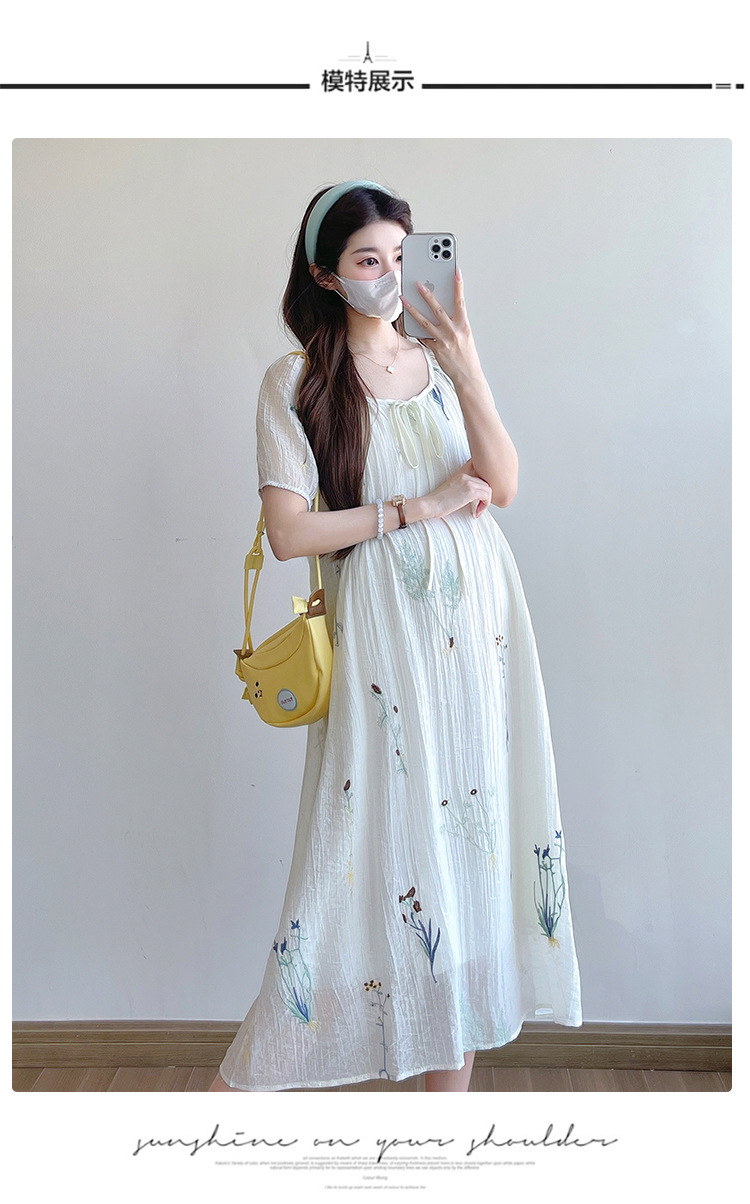 Реальная стрельба 2025 года одежда для беременных летом новая французская тяжелая промышленная вышивка цветочный темперамент тонкая и уменьшенная длинная юбка