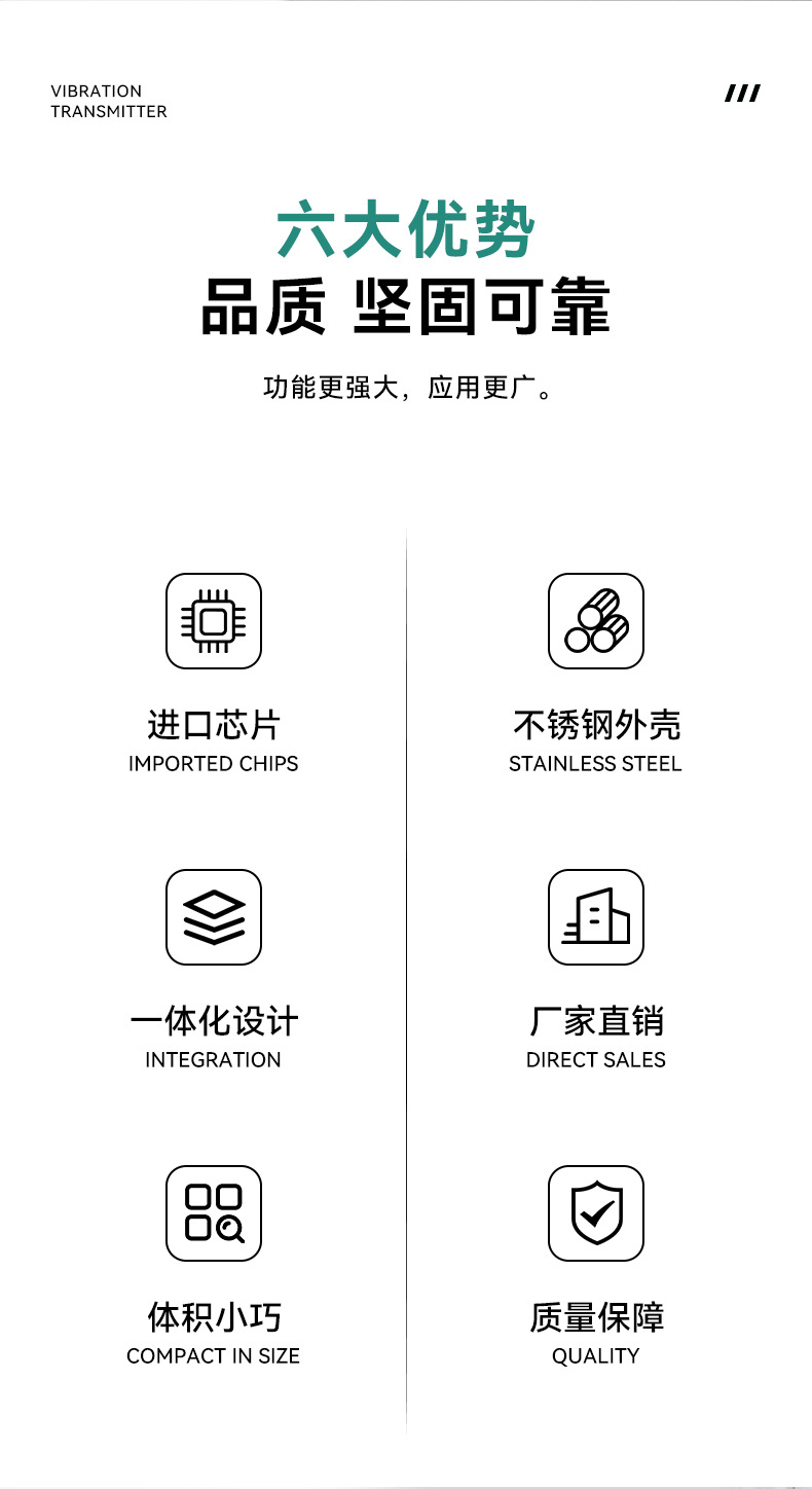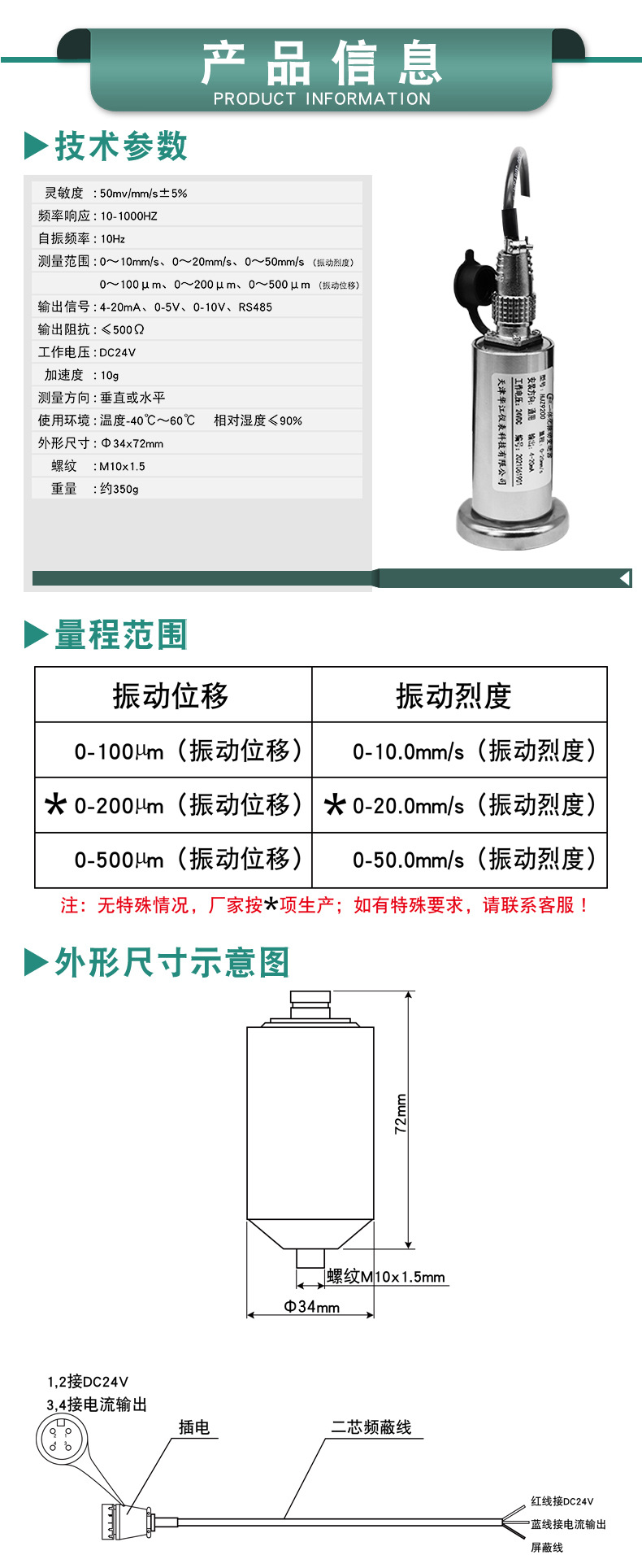 Скорость вибрации 0-10 мм/с, установка резьбы; Скорость вибрации 0-20 мм/с, установка резьбы; Скорость вибрации 0-50 мм/с, установка резьбы; Вибрационное смещение 0-100 мкм, установка резьбы; Вибрационное смещение 0-200 мкм, установка резьбы; Вибрационное смещение 0-500 мкм, установка резьбы; Скорость вибрации 0-10 мм/с. Установка на магнитном основании.; Скорость вибрации 0-20 мм/с, установка на магнитном основании; Скорость вибрации 0-50 мм/с, установка на магнитном основании; Вибрационное смещение 0–100 мкм, установка на магнитном основании; Вибрационное смещение 0–200 мкм, установка на магнитном основании; Вибрационное смещение 0–500 мкм, установка на магнитном основании; Вибрационное смещение 0-1000 мкм, установка резьбы; Вибрационное смещение 0–1000 мкм. Установка на магнитном основании.; Прямой выход (водонепроницаемая модель), установка с резьбой 0–10 мм/с.; Прямой выход (водонепроницаемая модель), установка с резьбой 0–20 мм/с.; Прямой выпуск (водонепроницаемая модель), установка с резьбой 0–50 мм/с.; Прямой выход (водонепроницаемая версия) Установка с резьбой 0–100 мкм; Прямой выход (водонепроницаемая модель) Установка с резьбой 0–200 мкм; Прямой выход (водонепроницаемая версия) Установка с резьбой 0–500 мкм; Взрывозащищенная резьбовая установка CT6; Выход RS485, повышение цены; С магнитным основанием за дополнительную плату; Чувствительность 20/50 мВ/мм/с Резьбовой монтаж; Скорость вибрации 0-100 мм/с, установка резьбы; С гибким металлическим кабелем длиной 3 м, дополнительная цена.