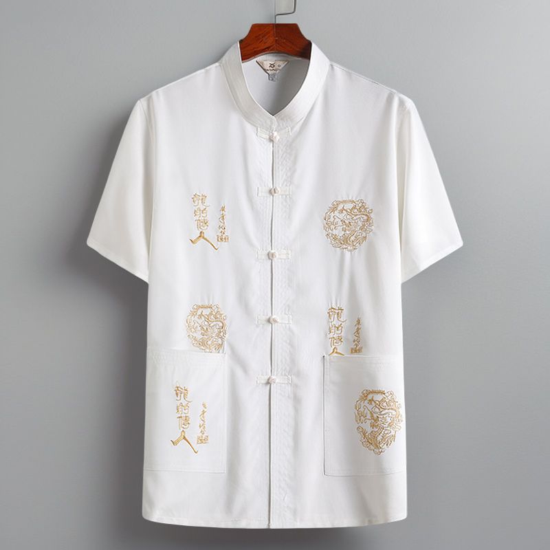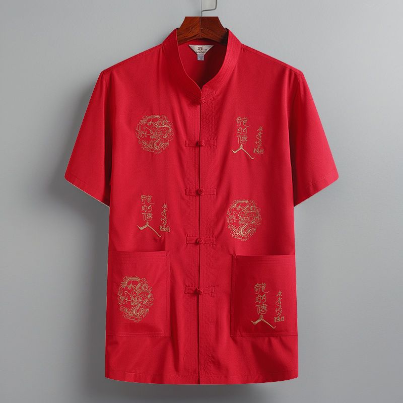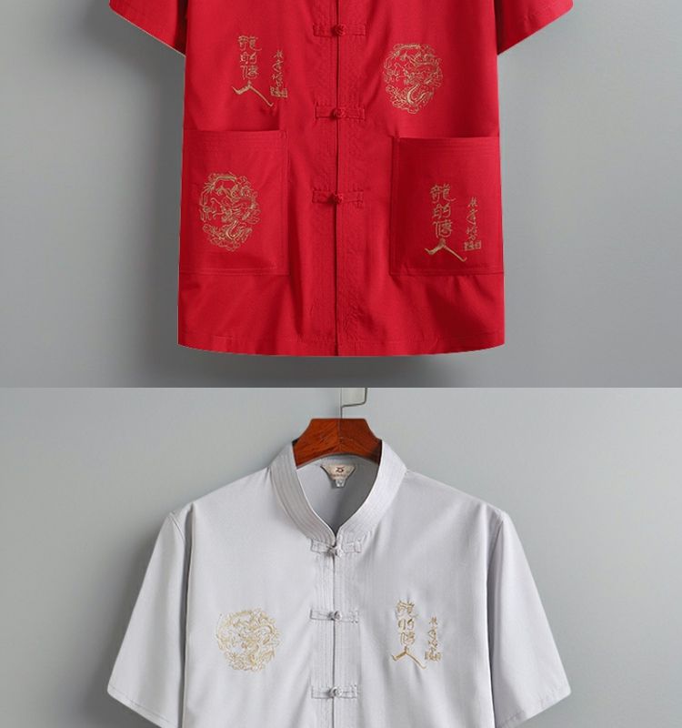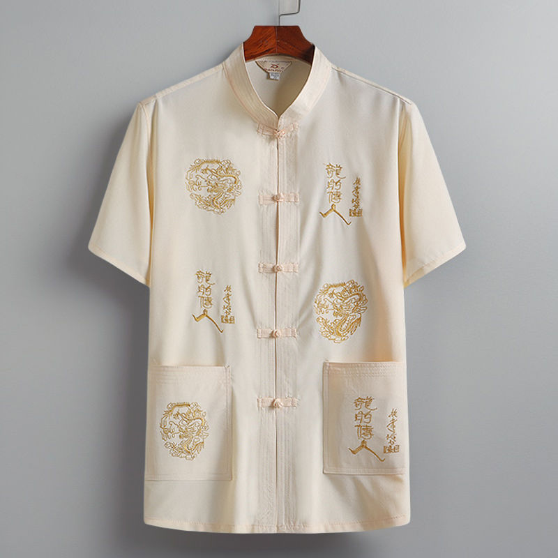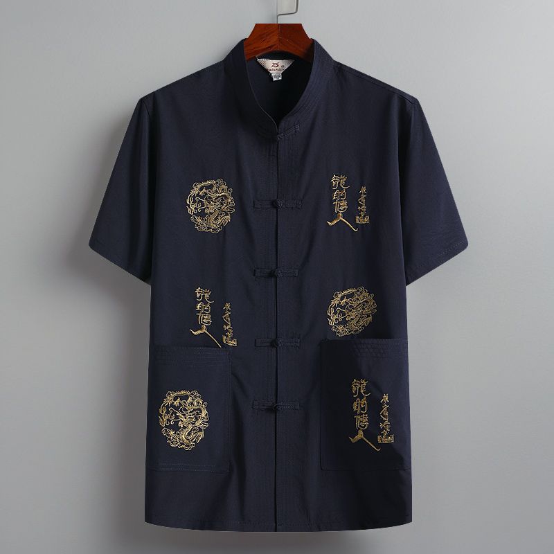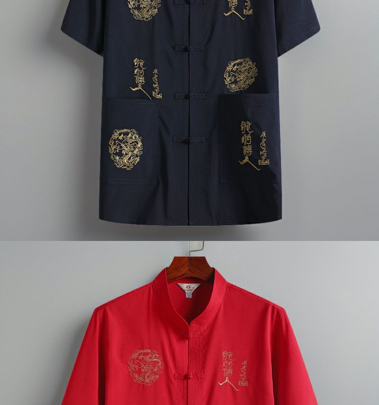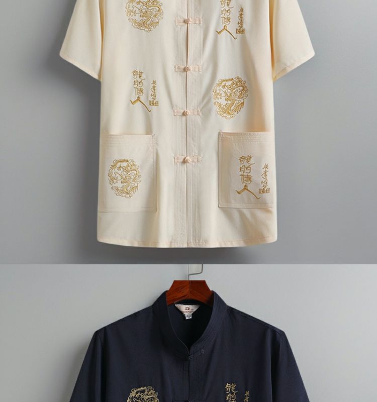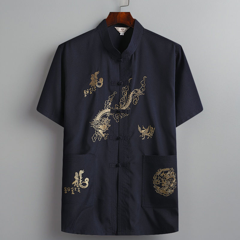Летний мужской костюм Тан для мужчин среднего и пожилого возраста, папа с вышивкой дракона, китайский стиль, дедушка, мужская рубашка с короткими рукавами в этническом стиле Ханфу