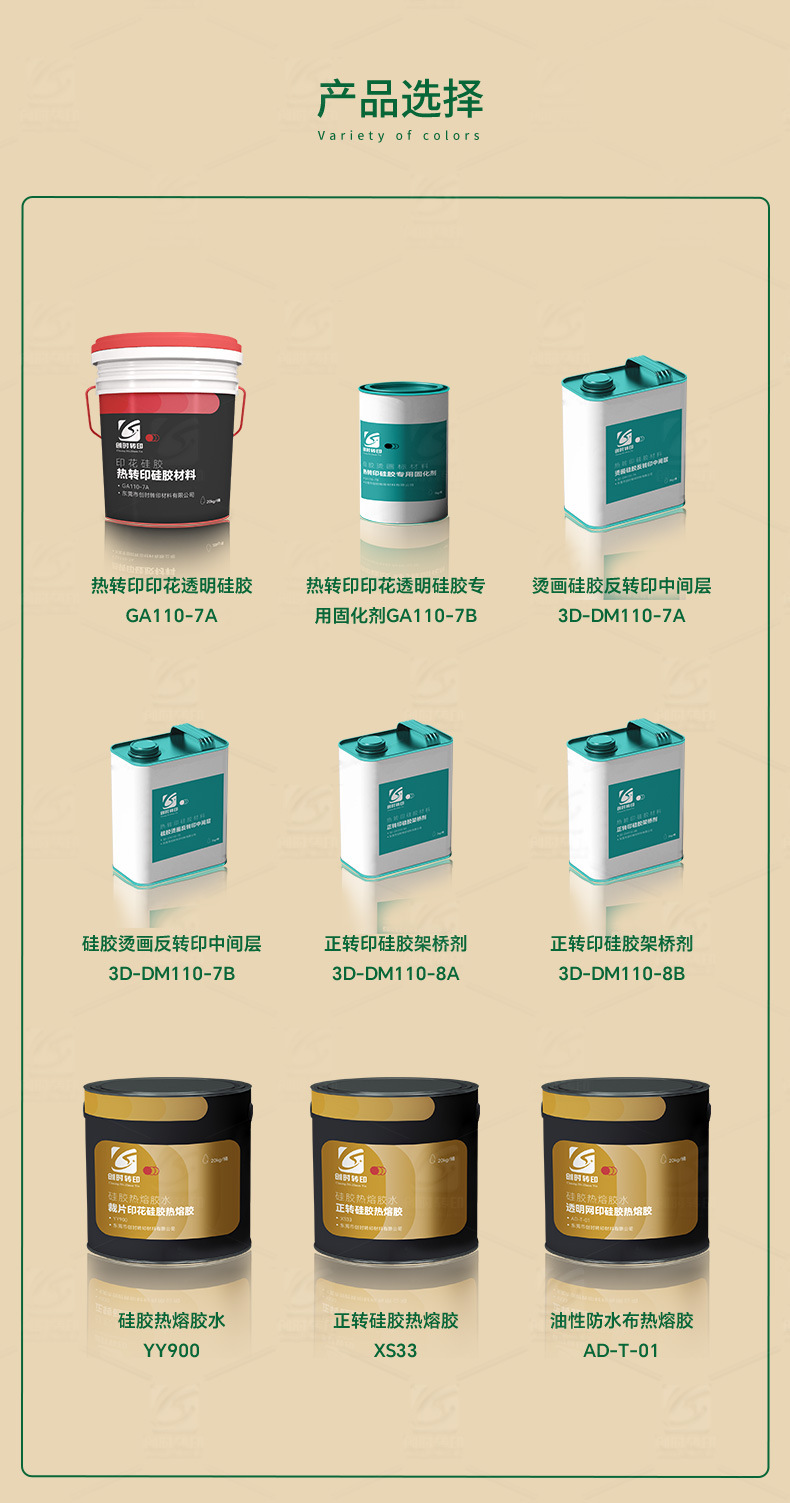 Термотрансферная печать прозрачный силикон GA110-7A; Термотрансферная печать, прозрачный силиконовый специальный отвердитель GA110-7B; Теплопередающий силиконовый средний слой с обратной печатью 3D-DM110-7A; Силиконовый теплообменный средний слой с обратной печатью 3D-DM110-7B; Силиконовый перекрестно-связывающий агент для передачи вперед 3D-DM110-8A; Силиконовый перекрестно-связывающий агент для передачи вперед 3D-DM110-8B; Силиконовый термоплавкий клей YY900; Передний силиконовый термоплавкий клей XS33; Термоплавкий клей для водонепроницаемой ткани на масляной основе AD-T-01; Образец 10 г