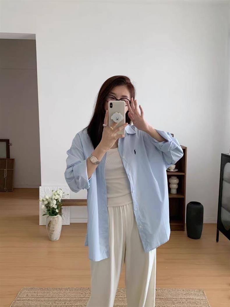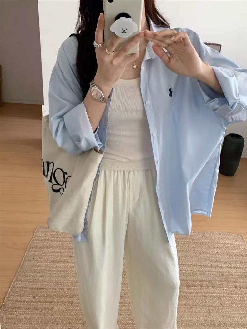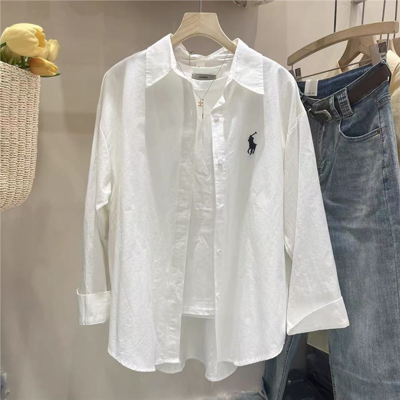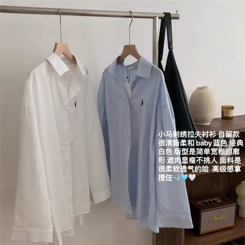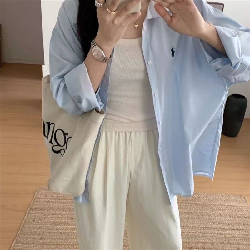 Повседневный синий свободный блузка топ 2024 корейская версия новая дикая вышивка с длинными рукавами рубашка пальто ins