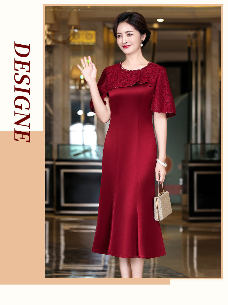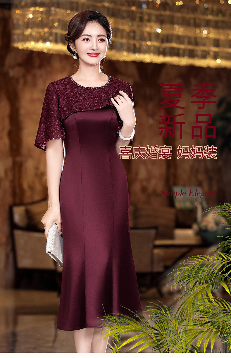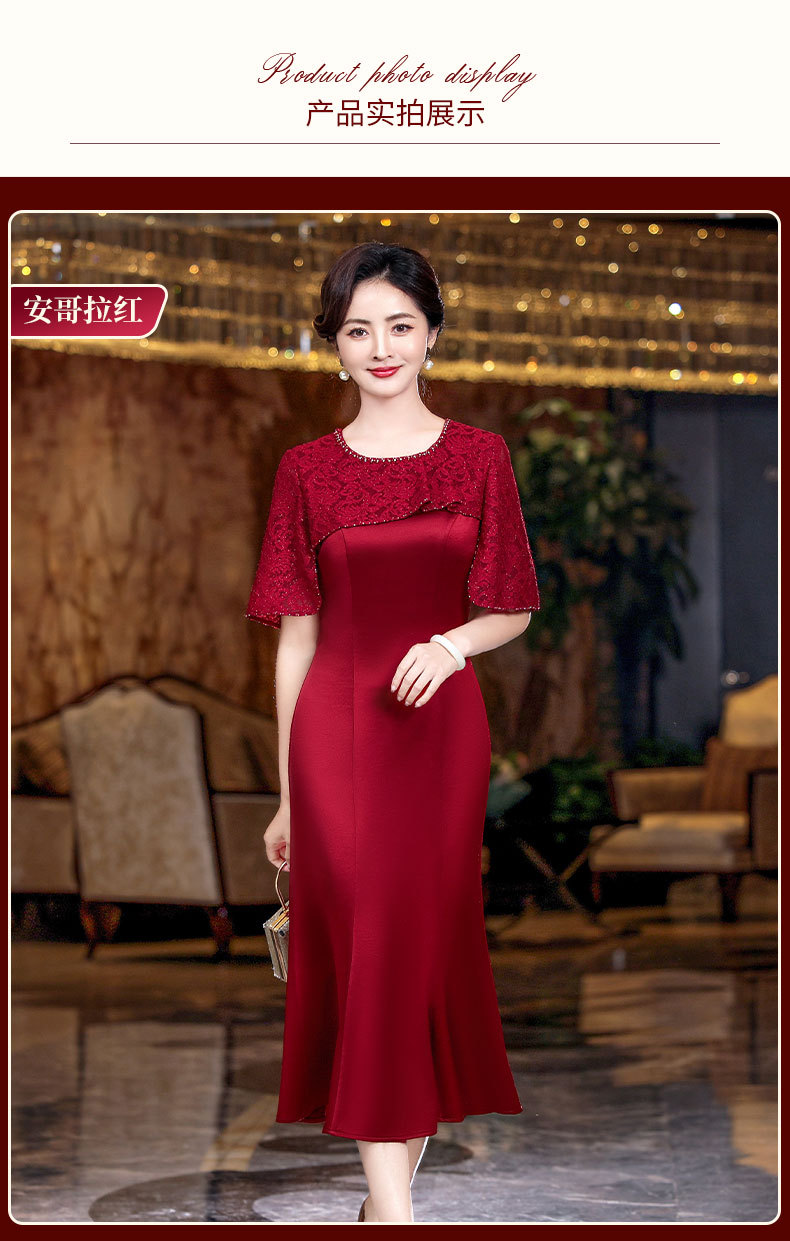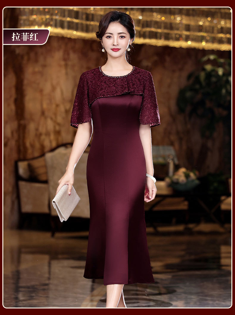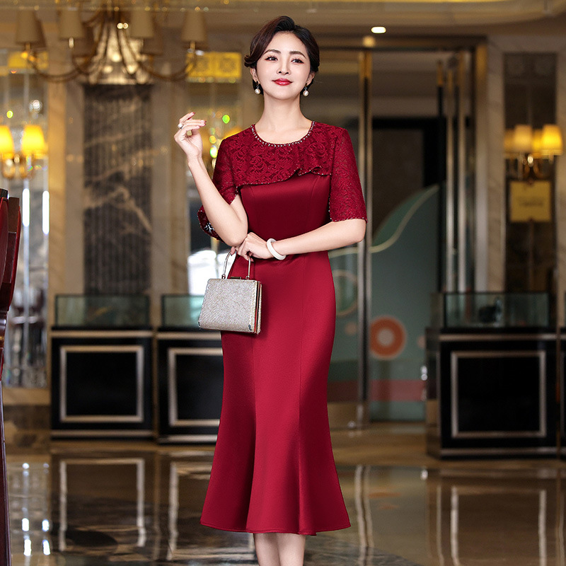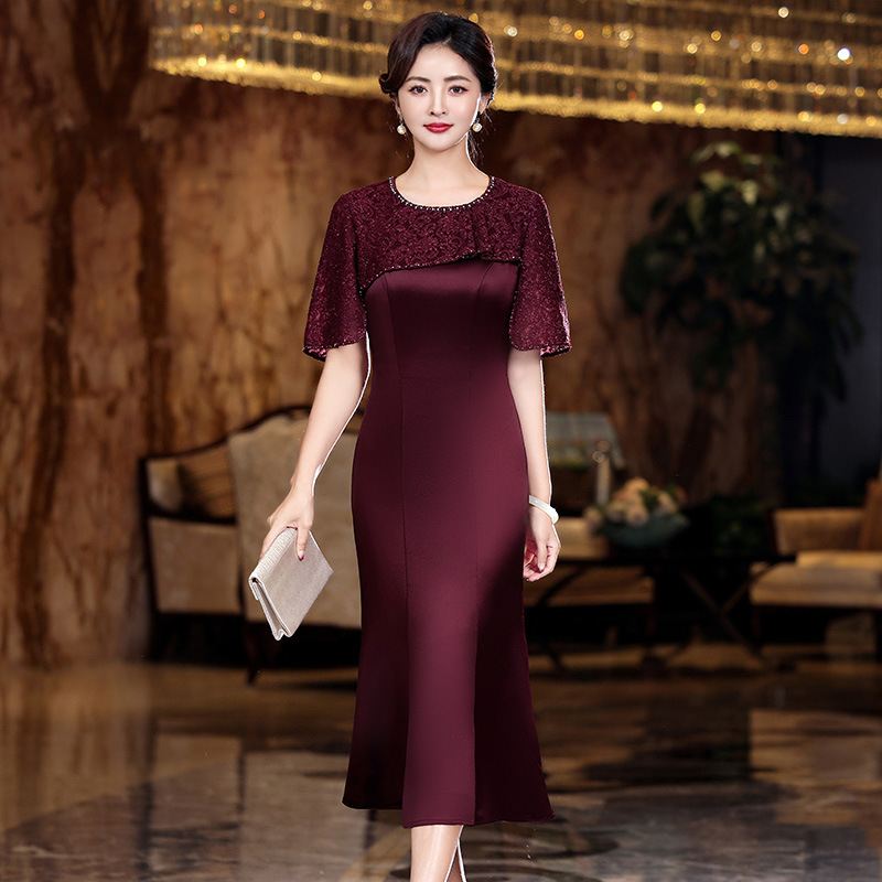 Летнее платье для свадебного банкета для свекрови, высококачественное, в стиле лёгкой роскоши, нишевое, новое, модное, из ацетата с кружевными вставками и юбкой-русалкой.