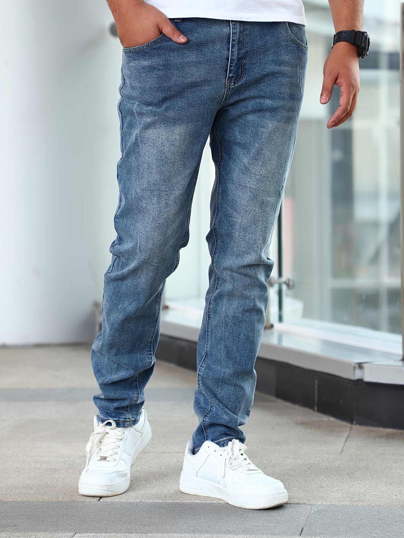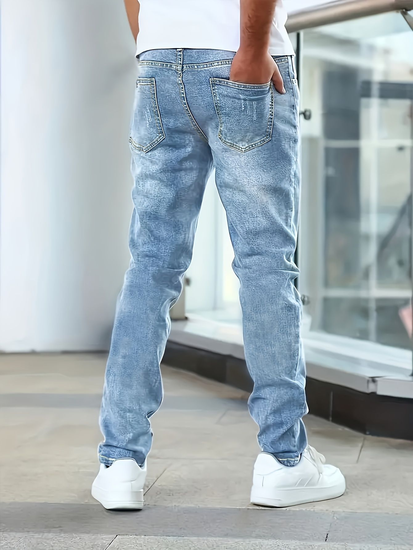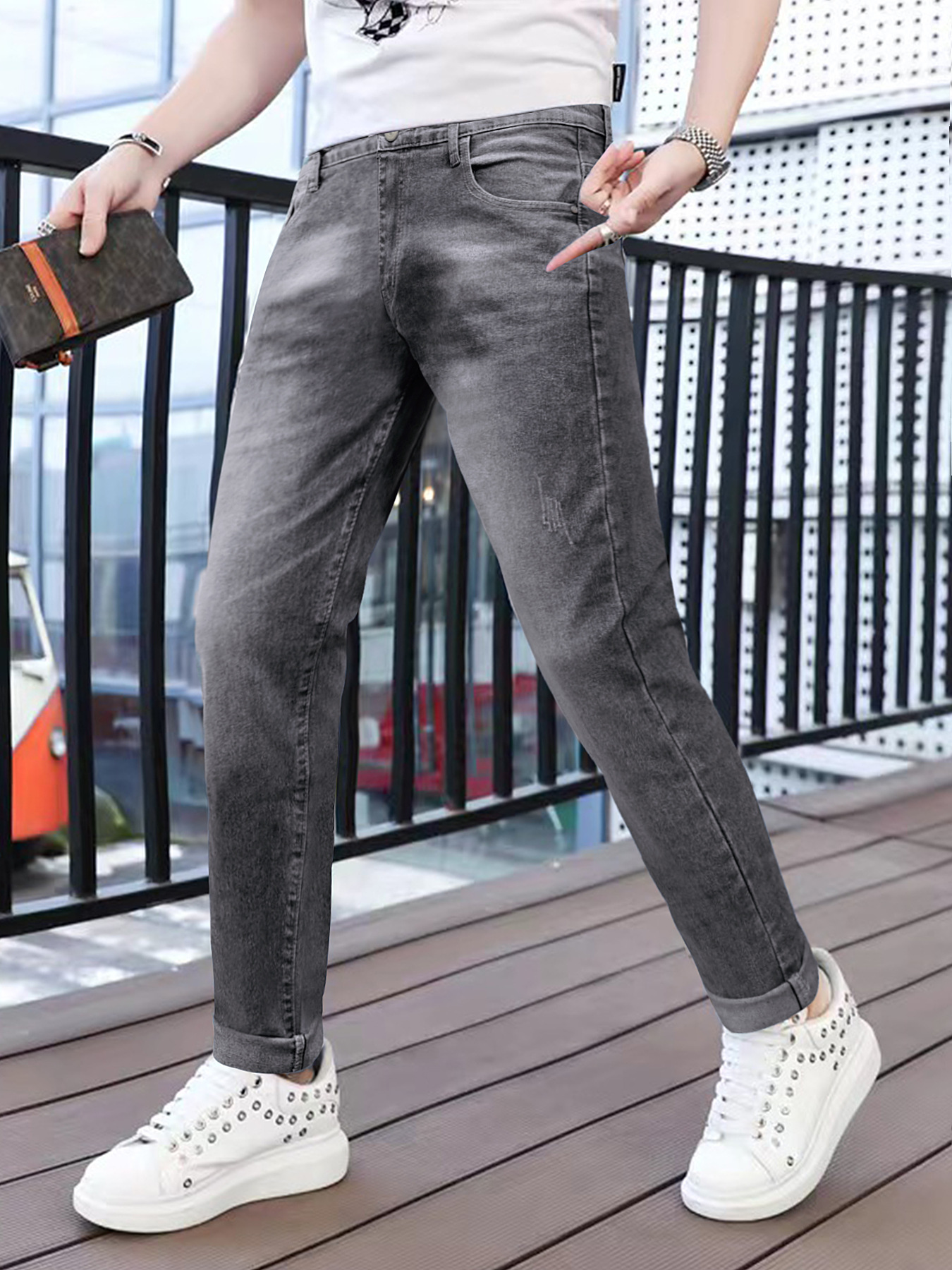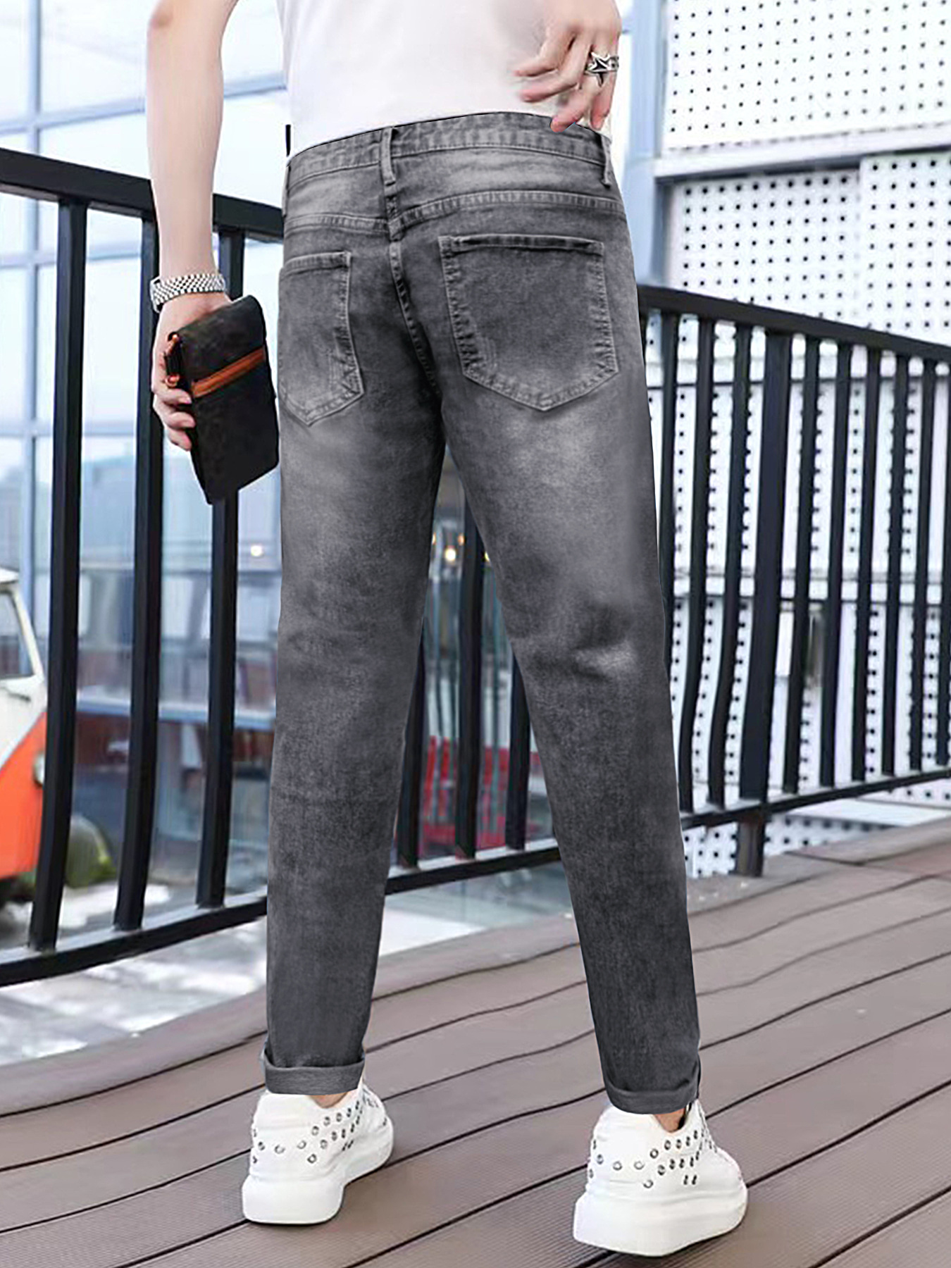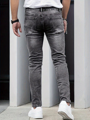 Популярные эластичные мужские повседневные однотонные джинсы Temu, мужские тонкие универсальные черные, серые, темно-синие мужские длинные брюки