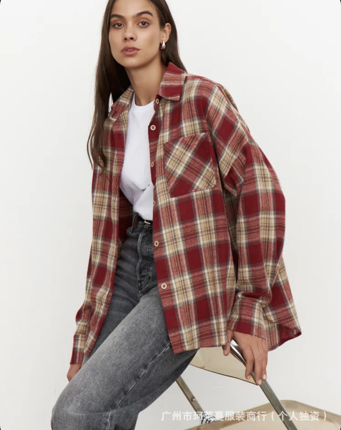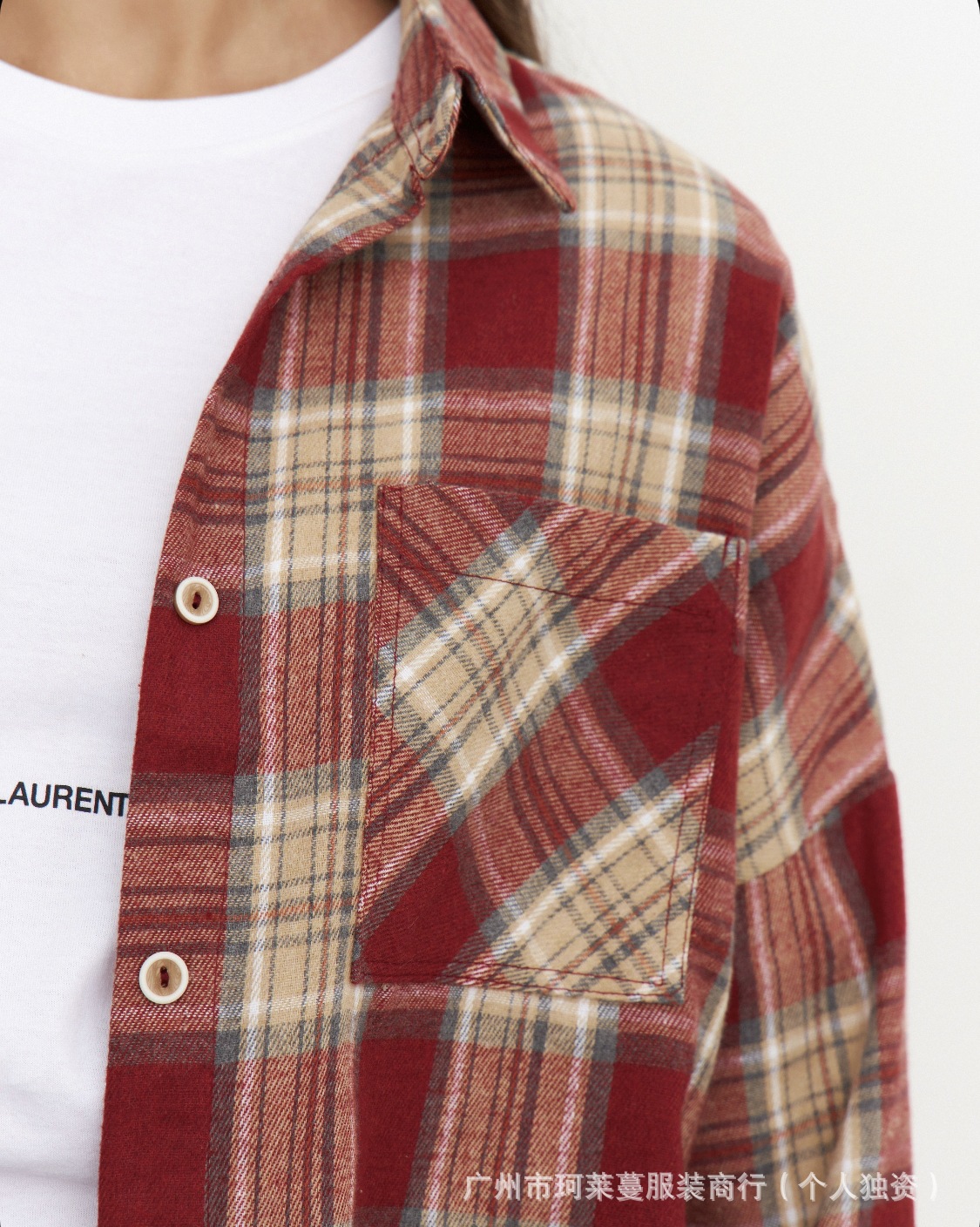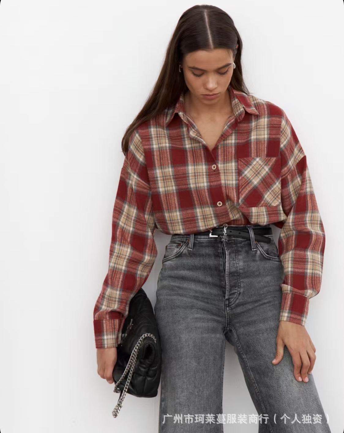 Amazon OZON трансграничная рубашка, женская универсальная рубашка в стиле ретро, весна-осень 2022, клетчатая полосатая рубашка с длинными рукавами и карманами с клапаном, брюки, рубашка