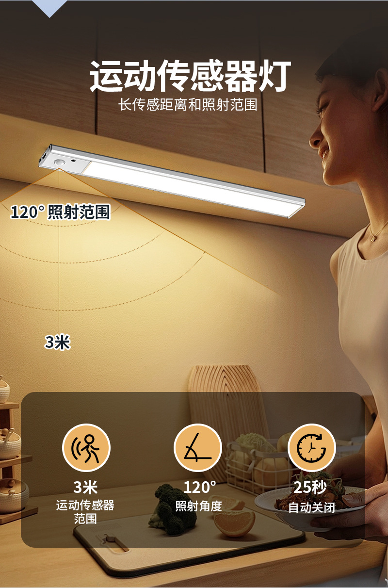超薄人体感应灯条 智能led长条自粘充电式橱柜酒柜衣柜自粘灯带