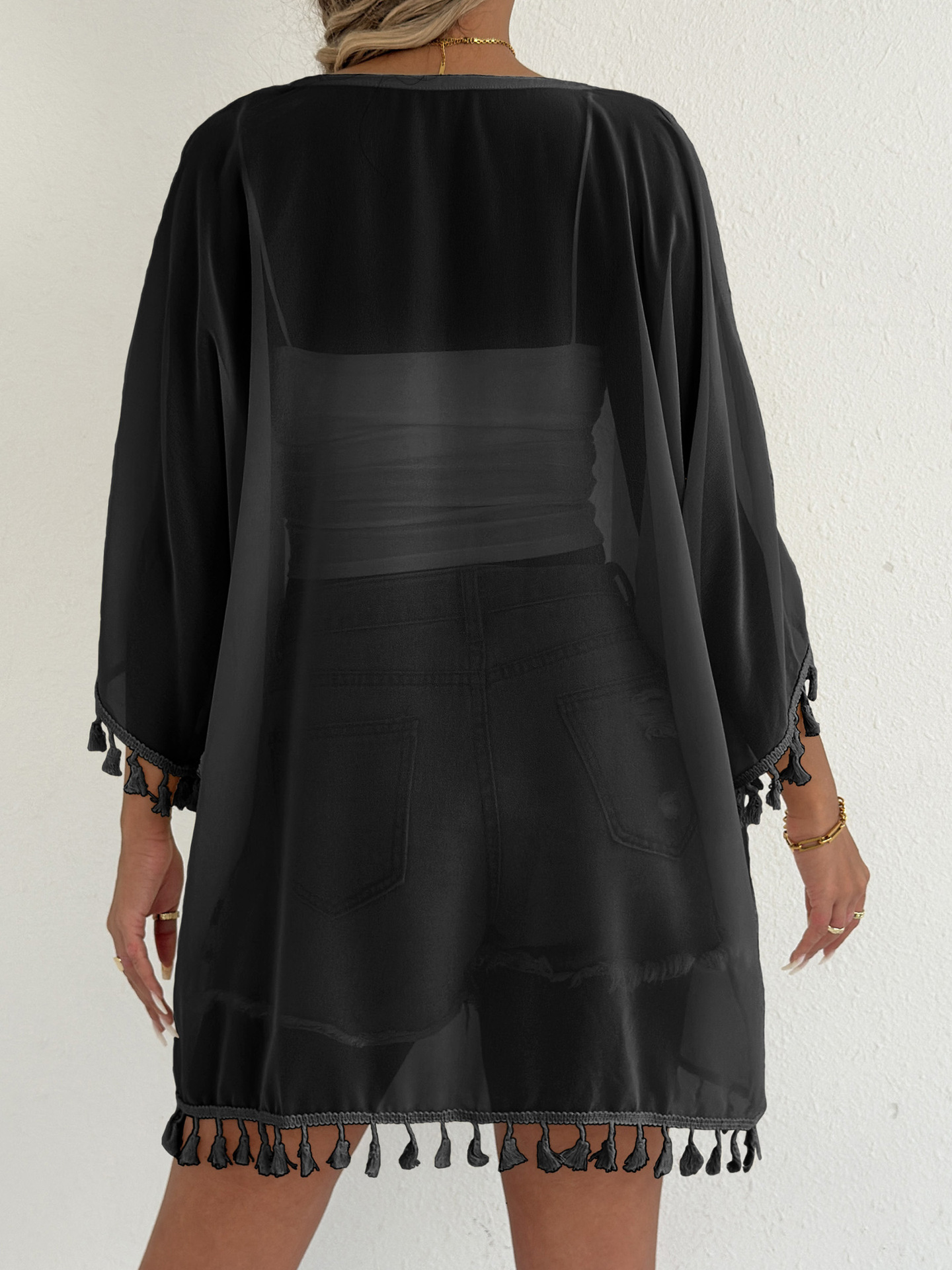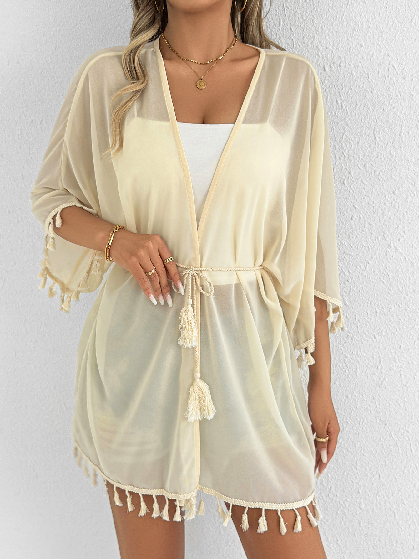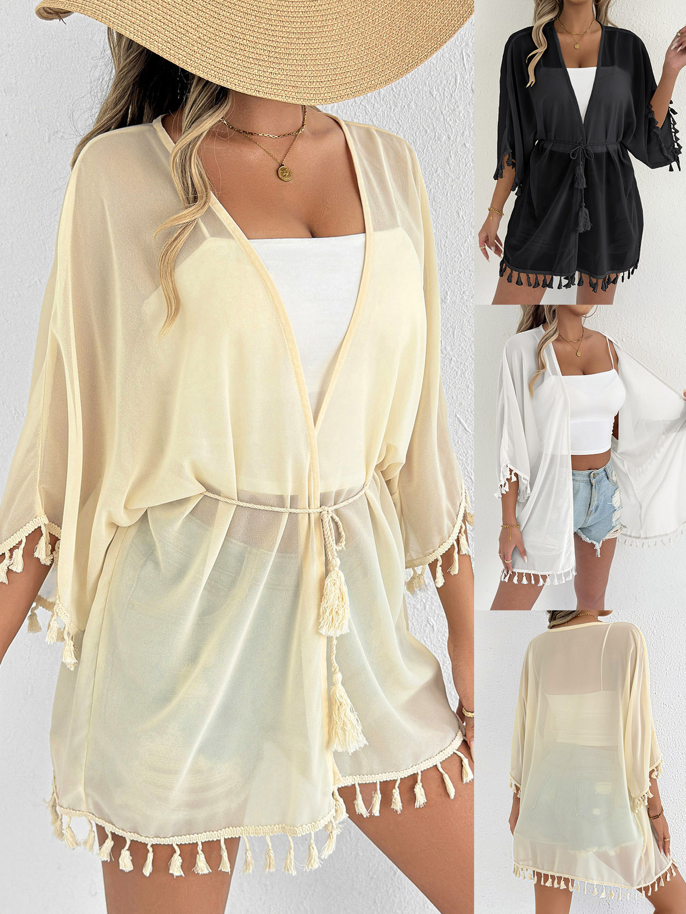 Женская шифоновая рубашка европейского и американского размера, женская однотонная повседневная пляжная рубашка с кисточками, бикини, солнцезащитная куртка, накидка