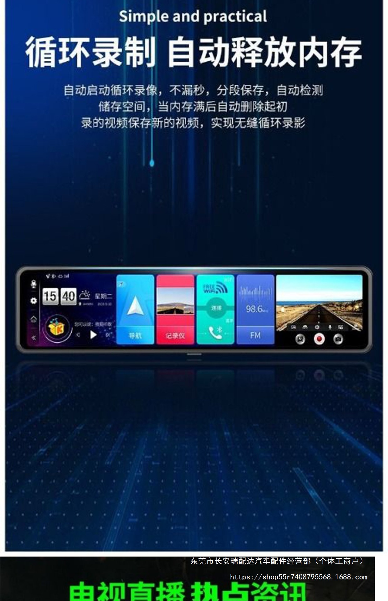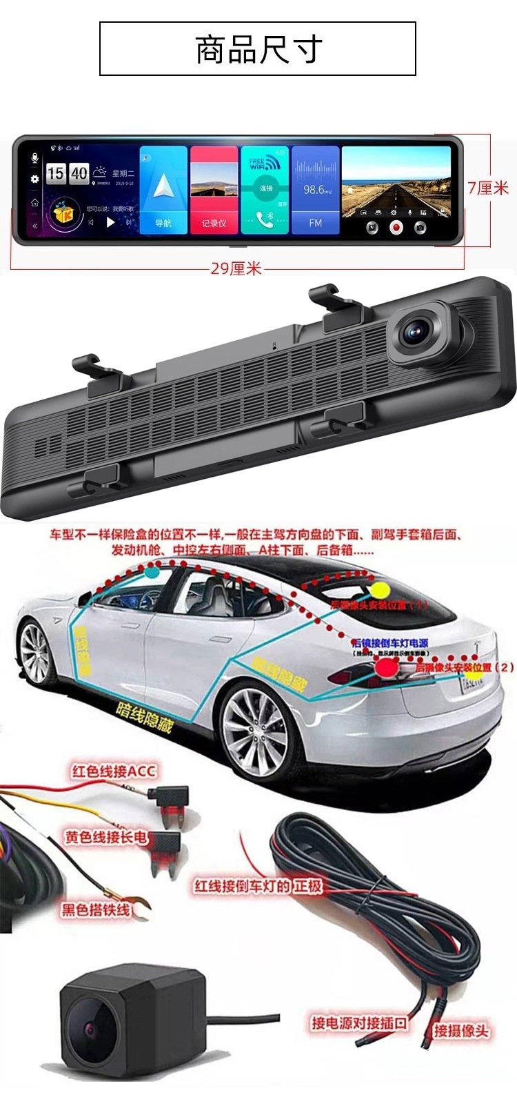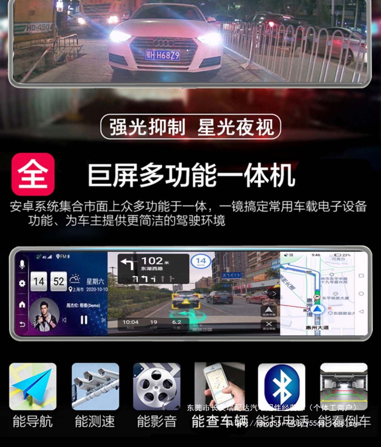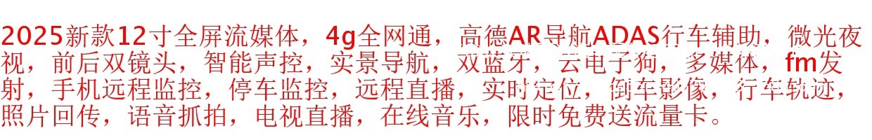 Bluetooth, GPS-навигация, позиционирование, изображение заднего вида, обнаружение движения, циклическая запись, измерение фиксированной скорости, мониторинг парковки, заполняющий свет ночного видения, помощь при смене полосы движения, запуск переднего автомобиля