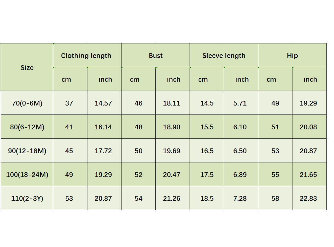70cm; 80cm; 90cm; 100cm; 110cm