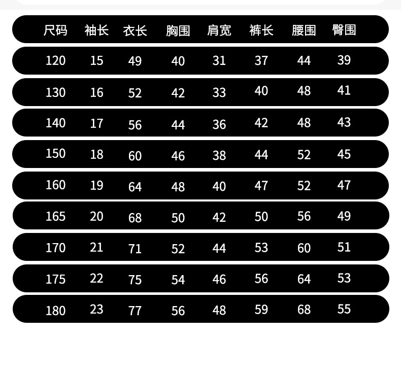 120cm; 130cm; 140cm; 150cm; 160cm; 165cm; 170cm; 175cm; 180cm